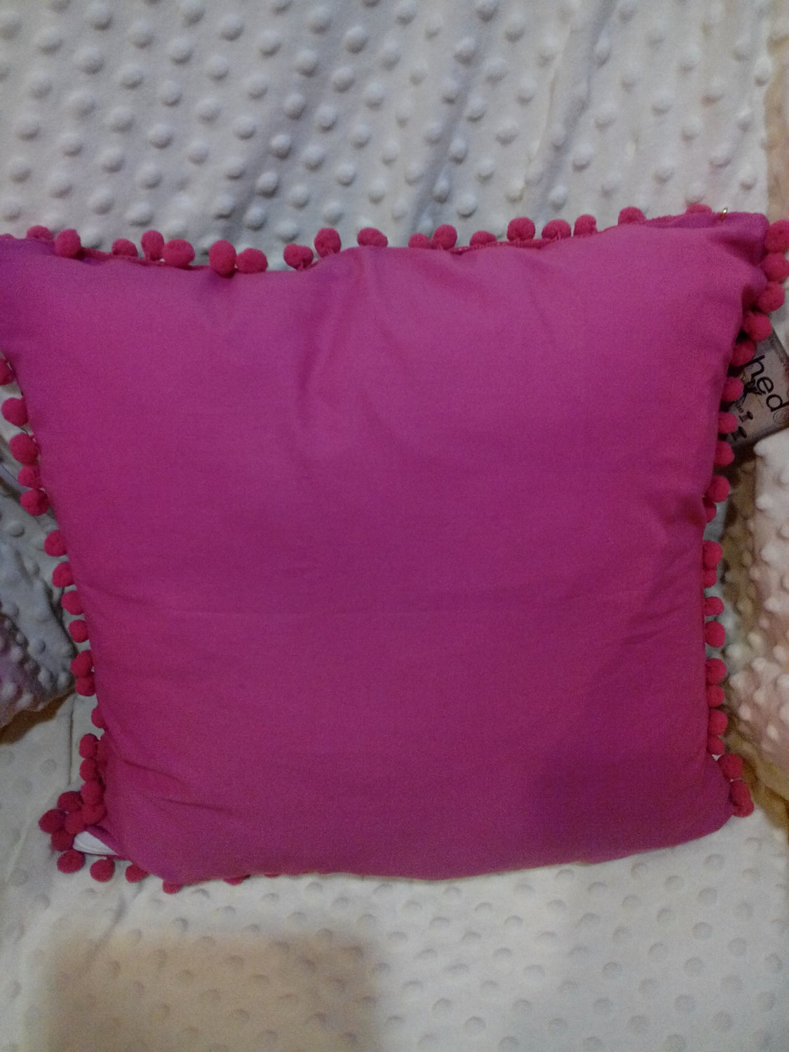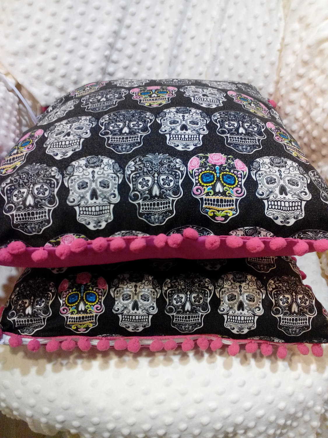 This listing is for one beautiful handmade deceptive pillow, 16×16 inches. This bright and fun dia de los Muertos sugar skull pink candy skull design with vibrant pink pompom trim and pink back is uniquely one of a kind! A wonderful addition to your living room couch, bedroom or guest room. Each pillow has a zipper for easy wash. All pillows are handmade therefore placement of design may vary due to the one of a kind nature of the item.