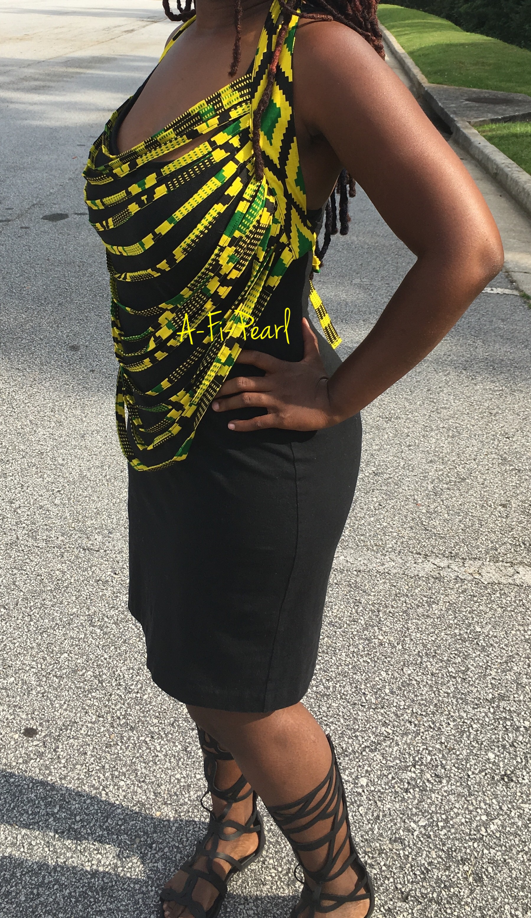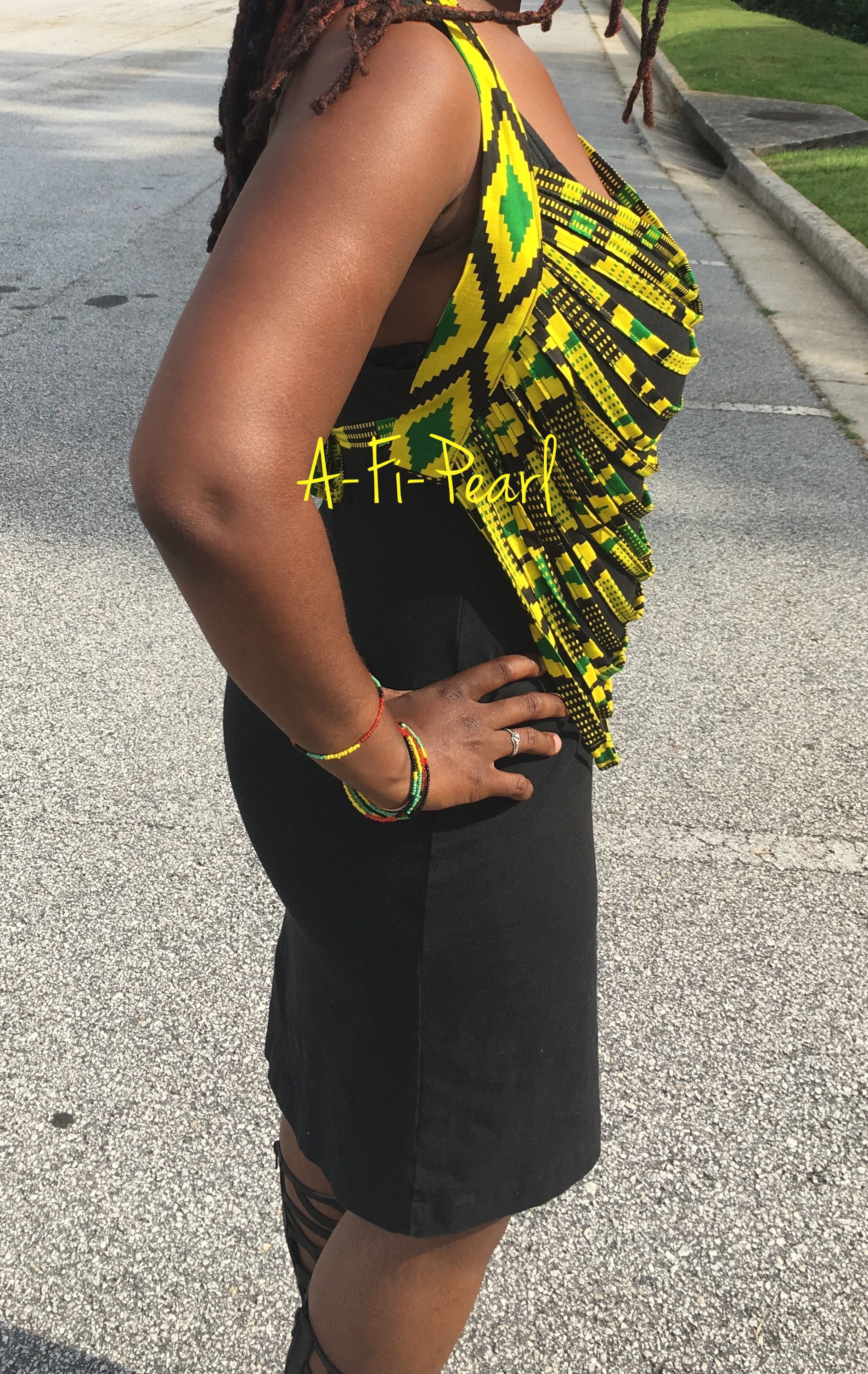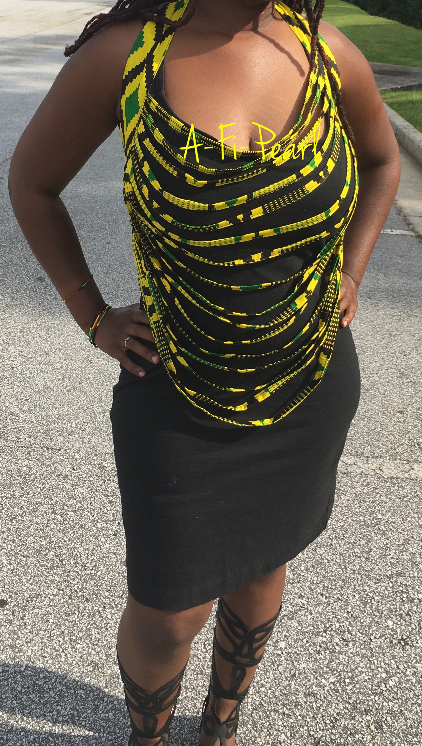 Jamaican inspired Body necklace goes over your neck, covers a portion of your top and ties in the back. Great statement necklace to spice up any outfit; swimsuit, a dress, or over a top. One size fits most. More colors and prints coming soon. Necklace pictured has Black, Green and yellow designs.