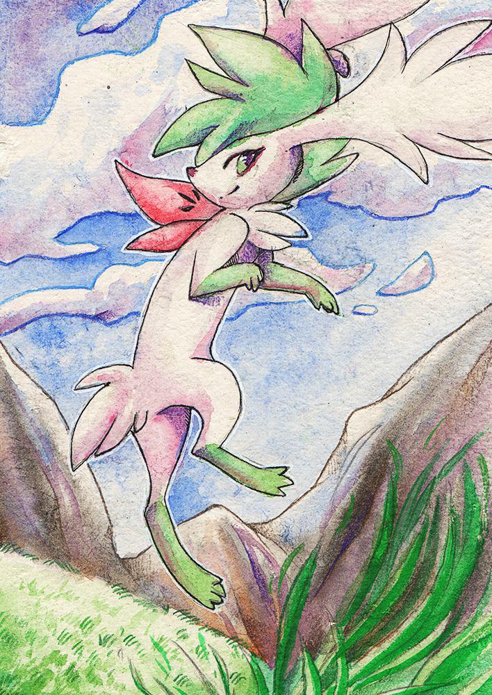 A 6" x 9" drawing of Shaymin (sky) on cotton watercolor paper. Painted with Winsor & Newton watercolors, Dr. Ph. Martin's Watercolor concentrate, Derwent Coloursoft pencils and a couple fountain pens.