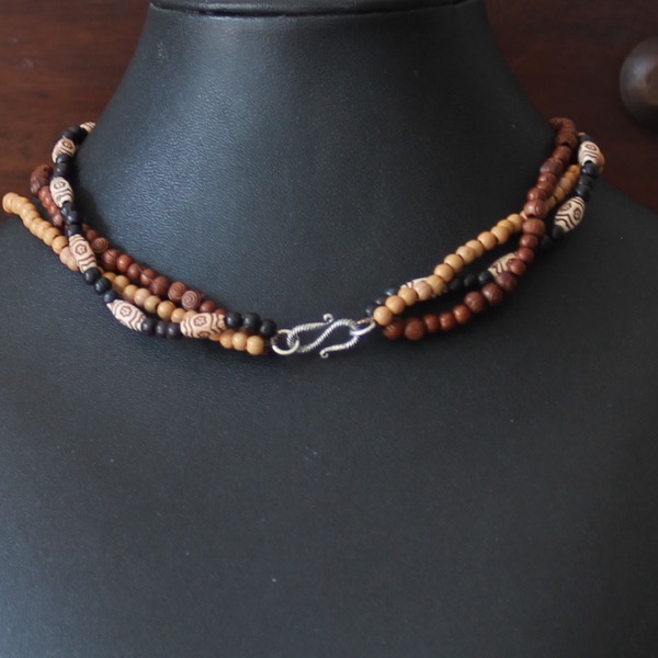 Three strands of acrylic beads with a fringe of beads and coins. Necklace is 14.5 inches long. Fringe hangs down 3.25 inches.
