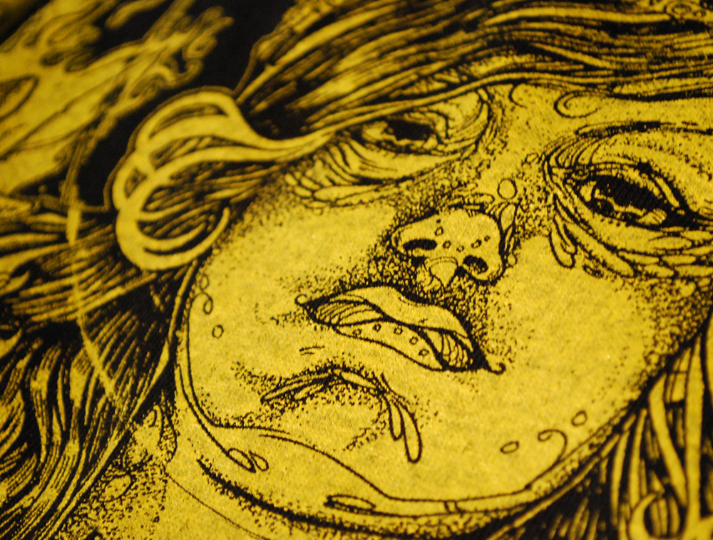 Revelation is a combo of meanings. I was inspired by art nouveau, the book of Revelation and Psalm 91 in the Bible. I wanted to create an image that captured the spirit of God. The female is the art nouveau representation. The phoenix represents the Holy Spirit and the protection of the Almighty's feathers. The eyes are the 7 eyes and 7 lamps with rising incense surrounding the throne of God. The print application is straight plastisol.