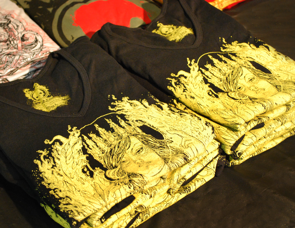 Revelation is a combo of meanings. I was inspired by art nouveau, the book of Revelation and Psalm 91 in the Bible. I wanted to create an image that captured the spirit of God. The female is the art nouveau representation. The phoenix represents the Holy Spirit and the protection of the Almighty's feathers. The eyes are the 7 eyes and 7 lamps with rising incense surrounding the throne of God. The print application is straight plastisol. This is a female cut shirt.