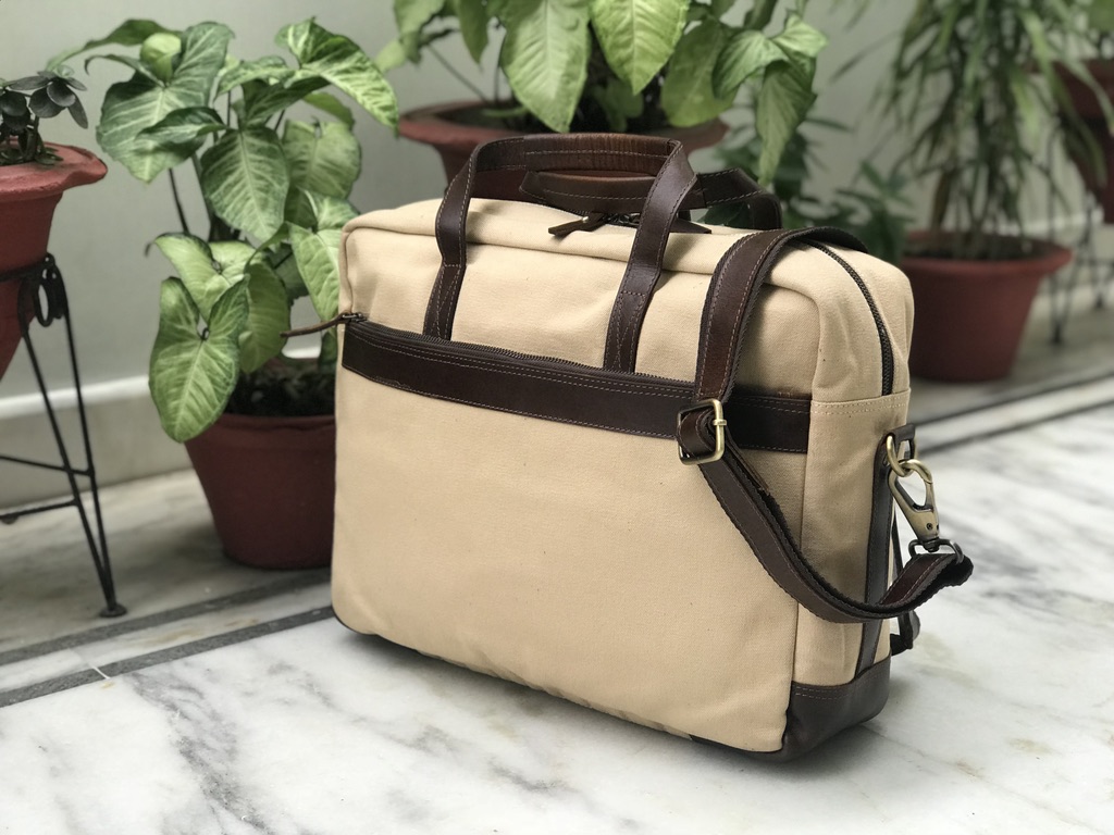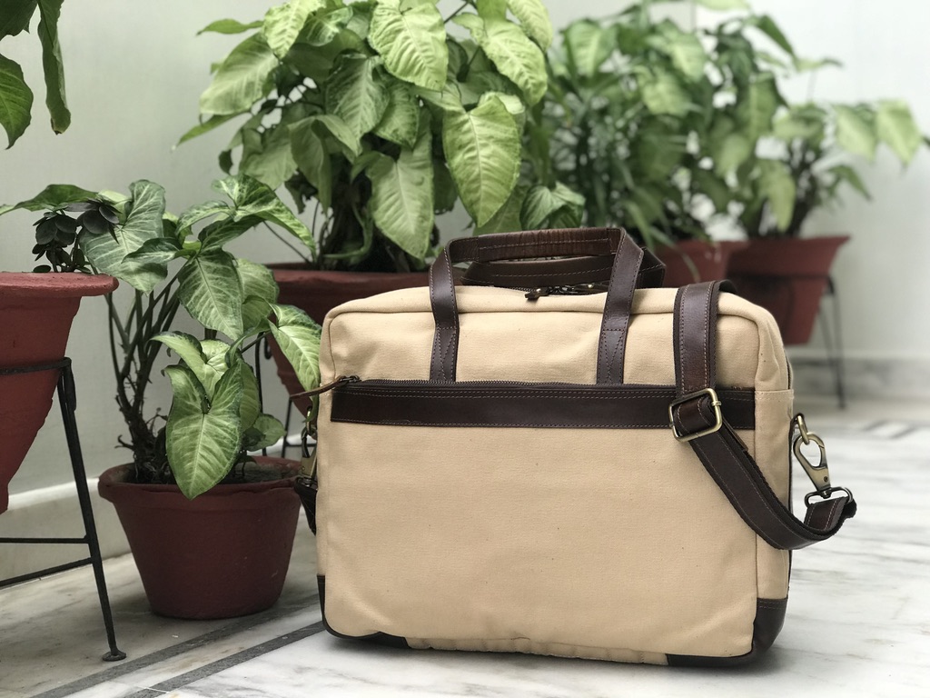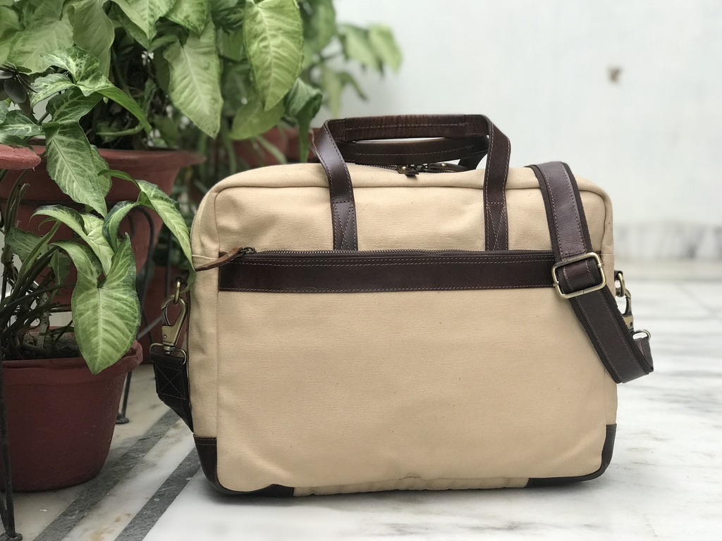 Zakara Cream Waxed Canvas Laptop Bag With Leather Trim is a medium sized canvas laptop bag which can be used as office bag or messenger bag for keeping laptop and files folder. This Cream Waxed Canvas Laptop Bag With Leather Trim is a cross body bag made with cream waxed canvas with veg. tanned leather trimming.