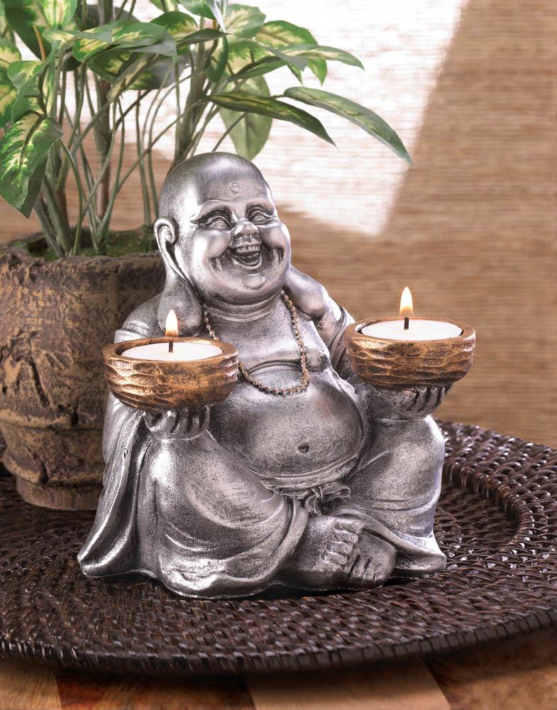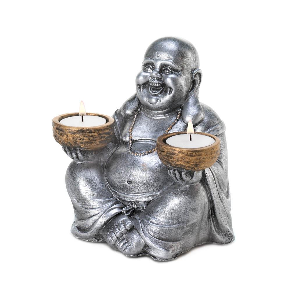 Illuminate your room with cheerful candlelight with this laughing Buddha statue. He will happily sit on your tabletop holding his bronzed candle bowls that are the perfect size for two tealight candles of your choice. His silver finish and smiling face is sure to lend some Zen charm to your decor. Candles not included.