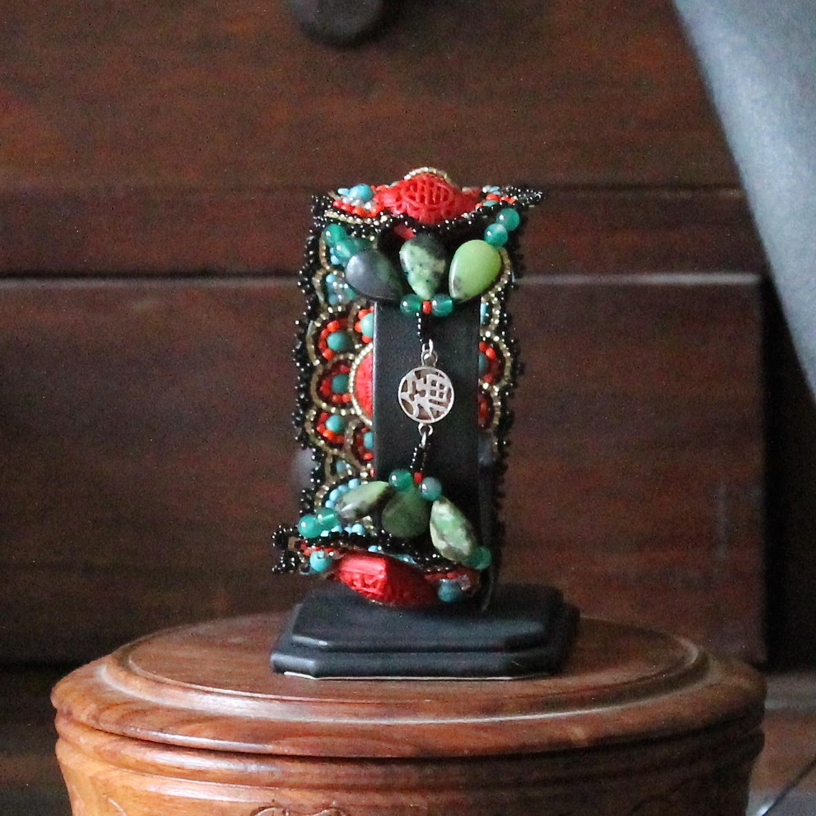 Yes, I was watching Marco Polo from Netflix when making this. Cinnabar, green agate, chrysoprase, seed beads, and turquoise. The main technique is brick stitch. The clasp is sterling silver. The bracelet is 7 inches long.