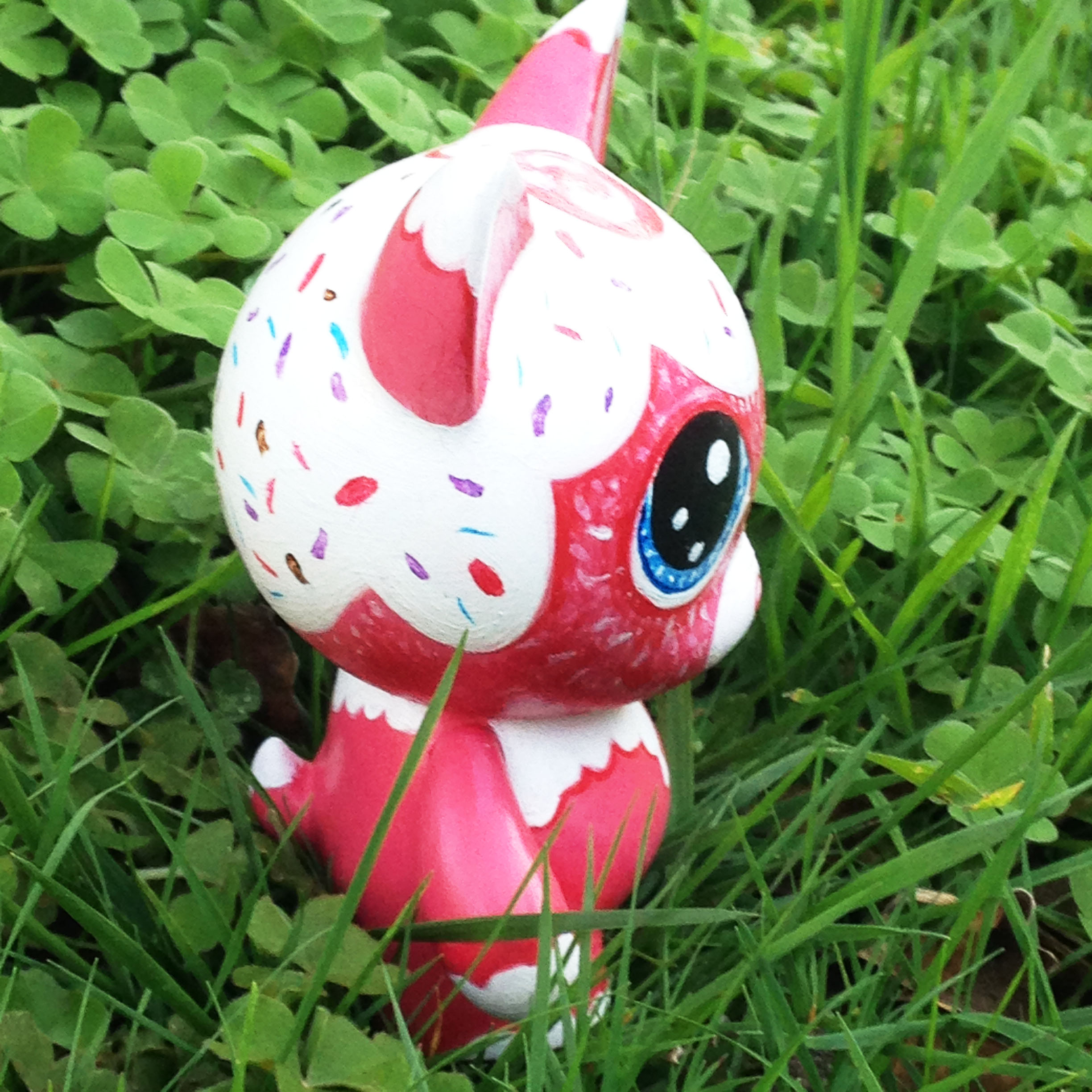 This is strawberry Sundae Kitty. She is a vinyl Trikky doll by kid robot, hand painted with acrylics by me. This doll stands about 4 1/2 inches tall and is 3 1/2 inches wide. 50% of the proceeds from this art doll will go to the art is life fund to help people with debilitating illnesses get the care they need.