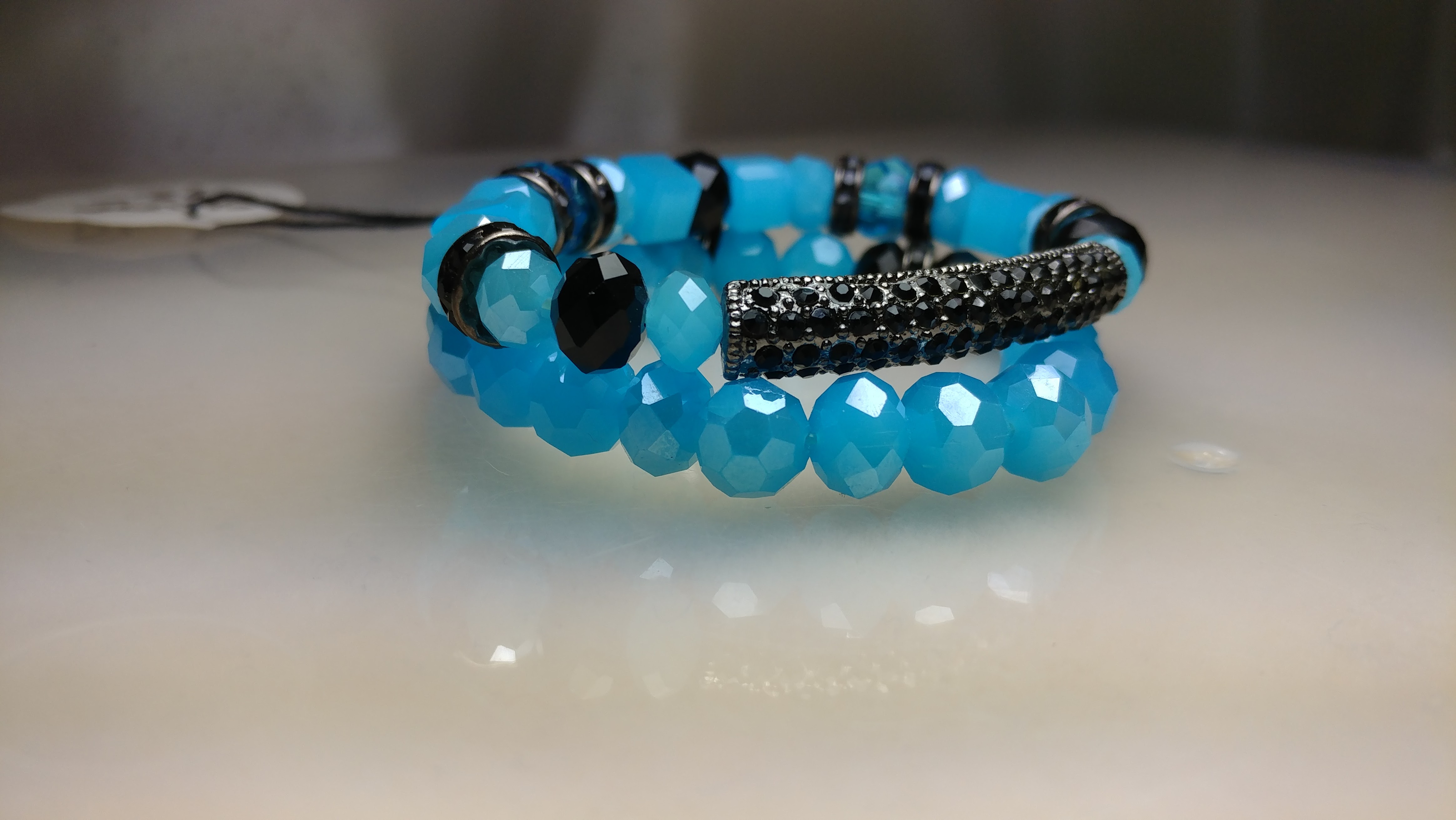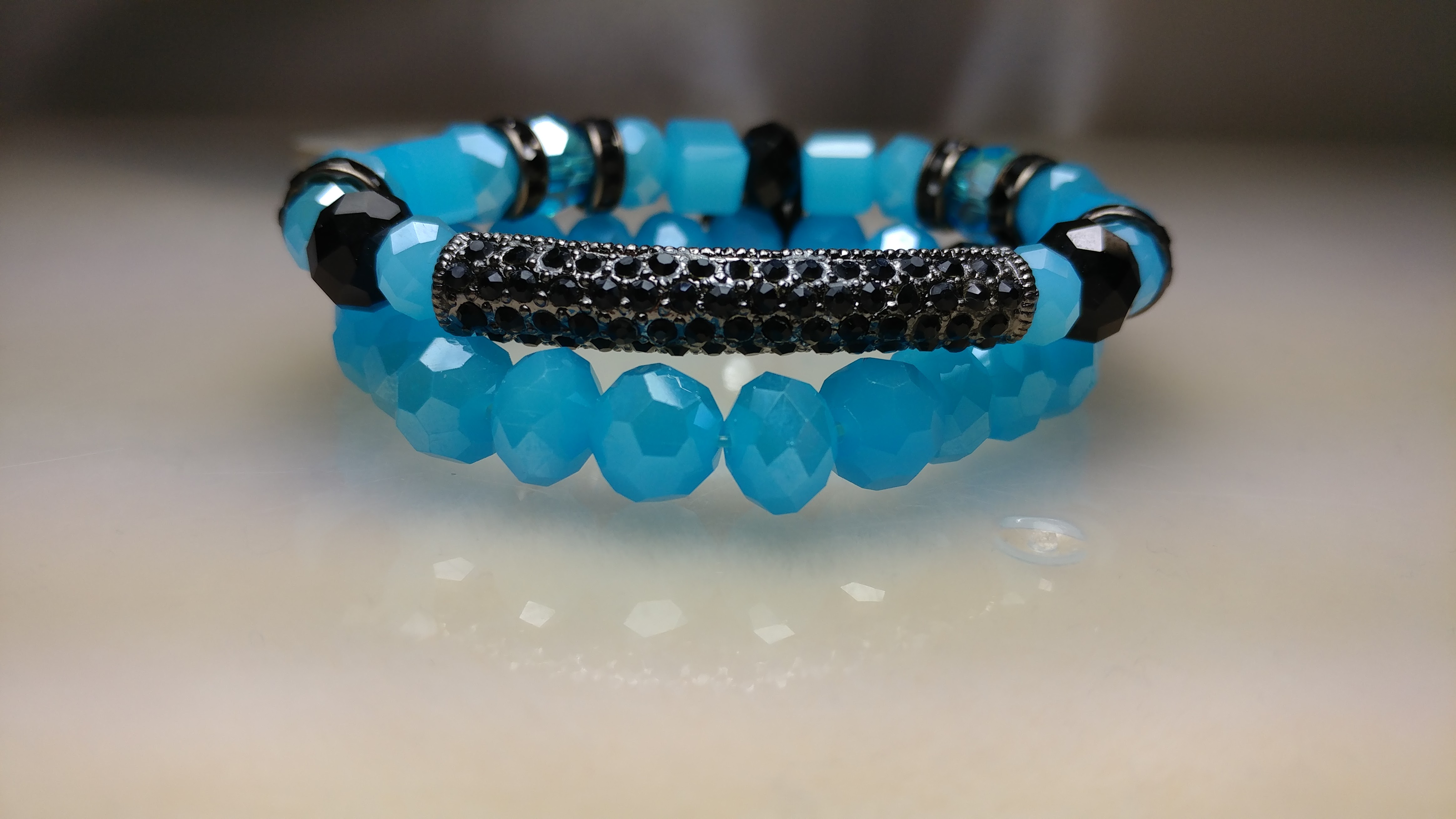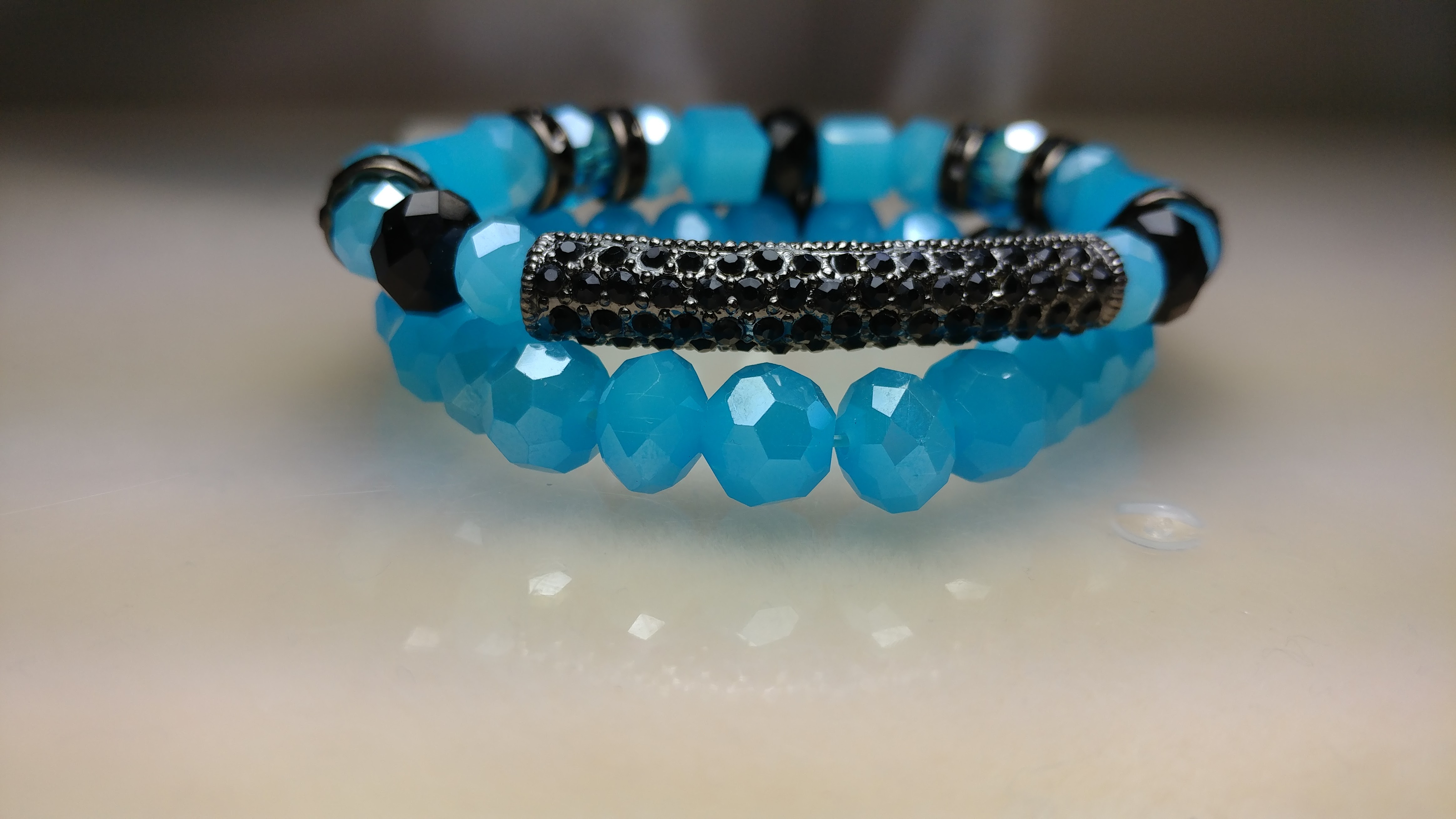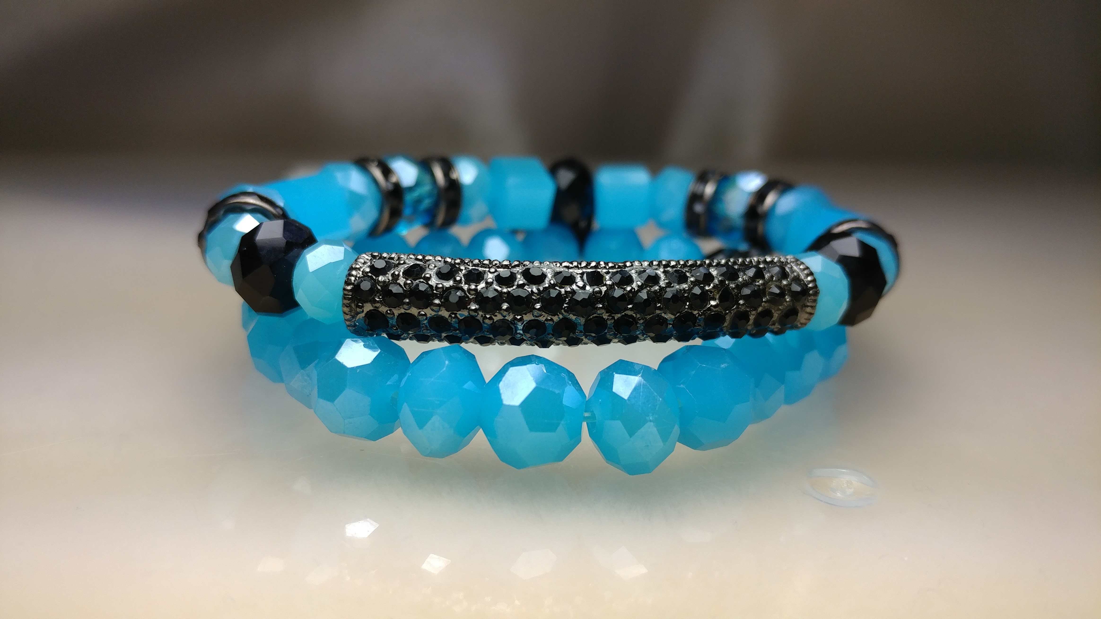 Hand made with a black rhinestone connector surround around a beautiful blue glass bead and black, spaced with a black rhinestone spacer on a clear stretchy cord.