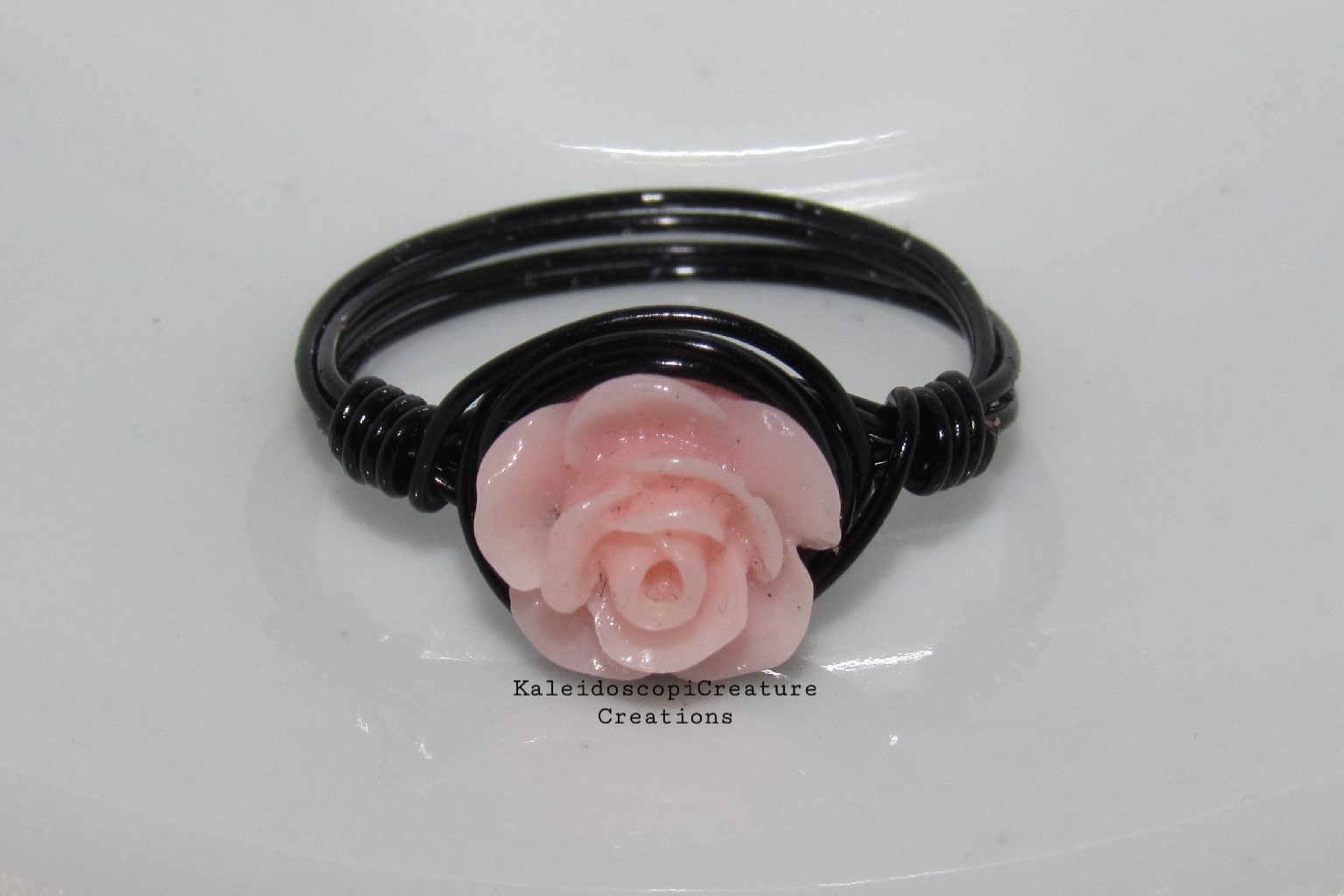 Handmade! Any size, regular or midi! These flower rings make the best midi rings to turn your hand into your own personal garden Pastel Pink Rose (10mm) wrapped in a black coated copper wire. The black wire is non-tarnish but if you chip or scratch the black coating off copper will show through, so please be careful to ensure it stays in good quality. The ring is durable for everyday use but NOT indestructible though i wish it was, hehehe.