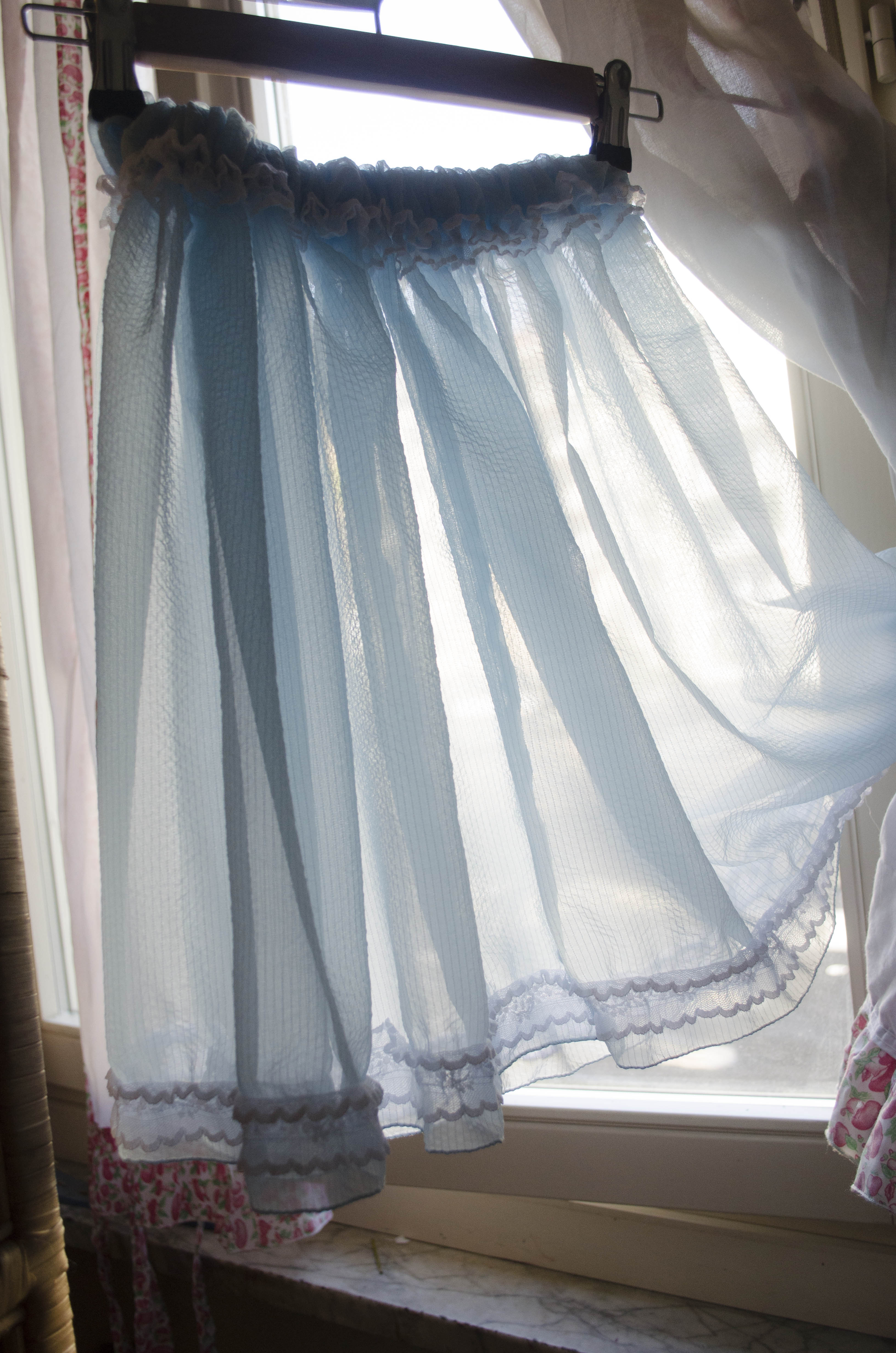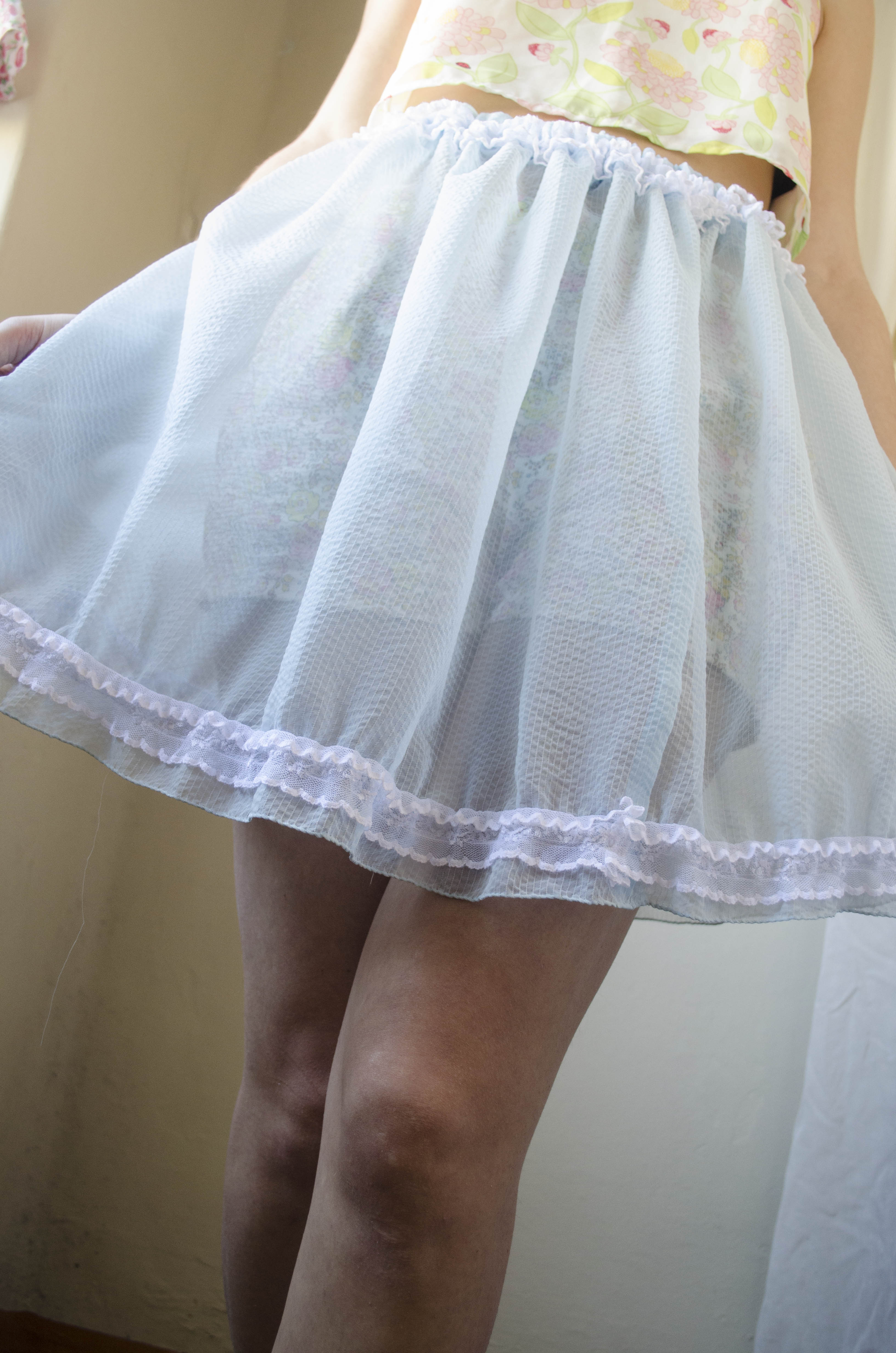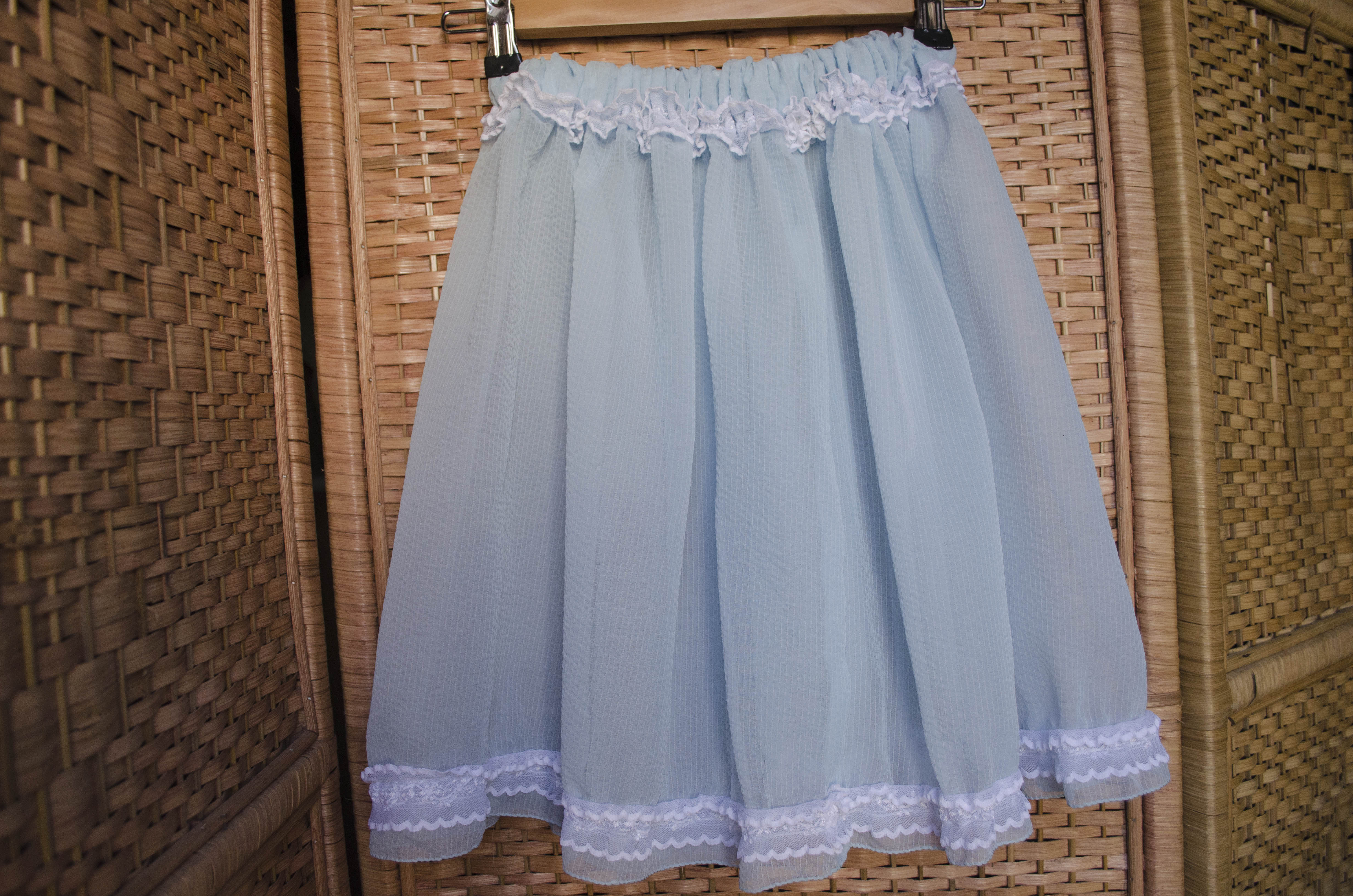 Handmade skirt perfect for cultparty-kei or fairy-kei outfits made in trasparent light blue material with lace details materials: white lace, light blue synthetics fabric. size: S/M waist: 58/99 cm skirt length: 45 cm if you need a fast or tracking shipping service need a increase on the shipping price ( please send me a message in this case)