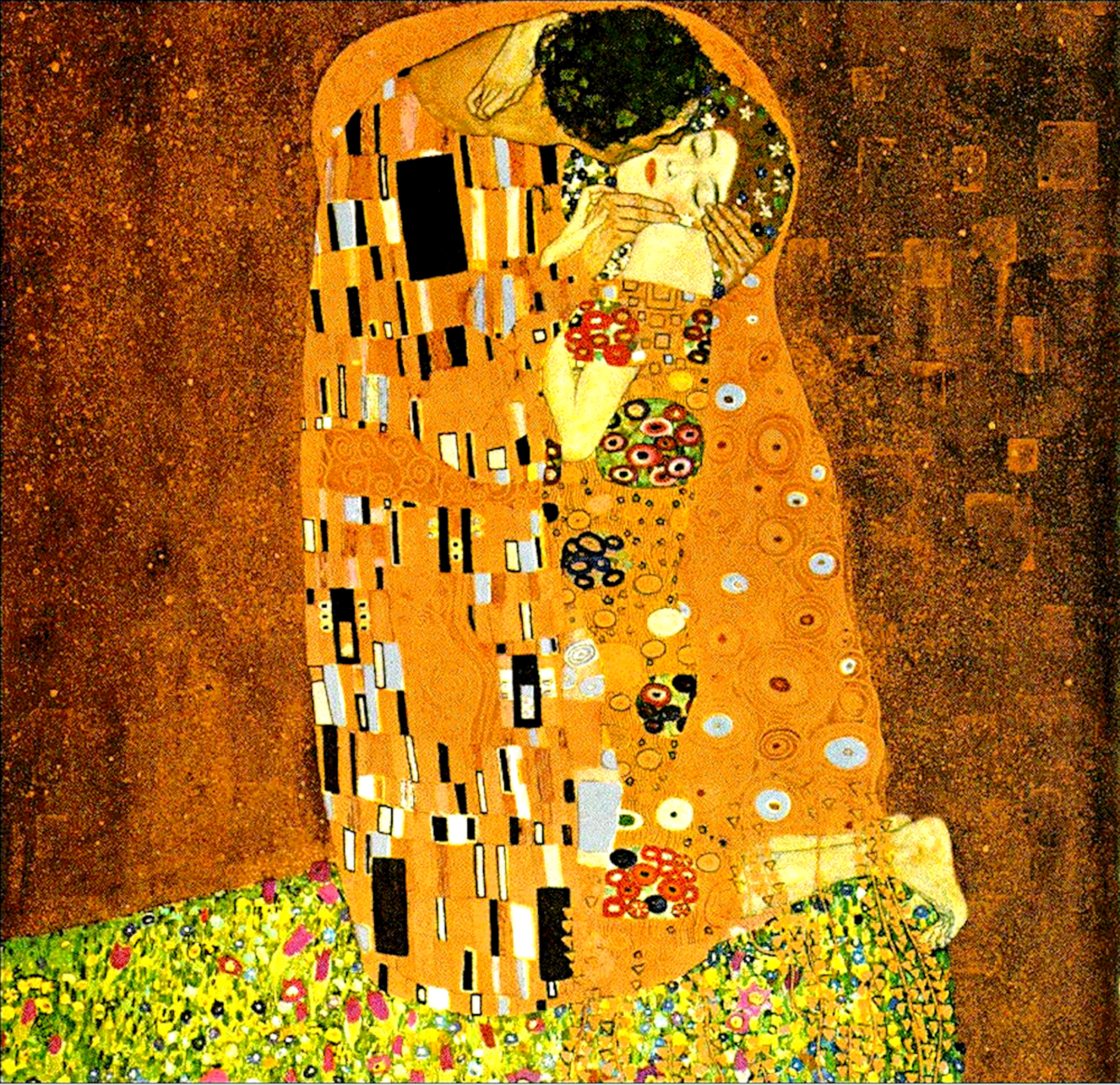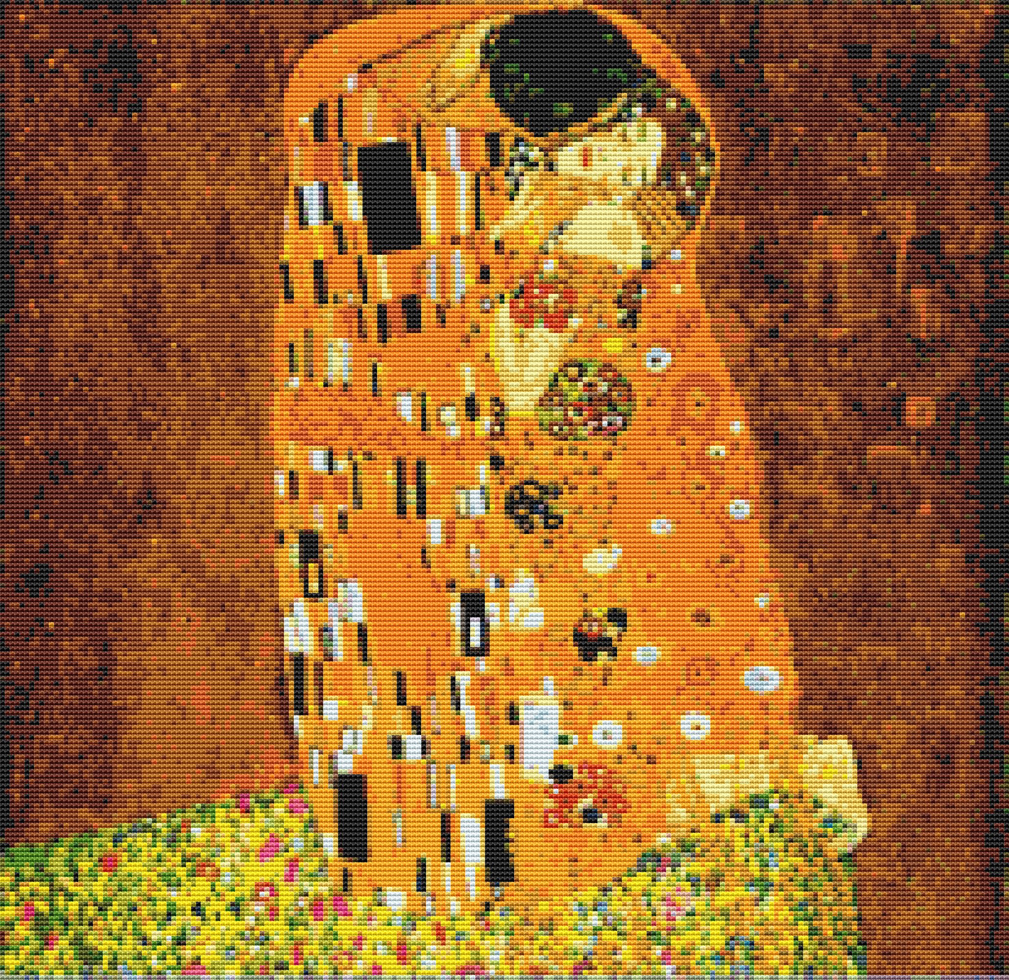 This cross stitch pattern from the artwork of Gustav Klimt of a man giving the woman in his arms a kiss.