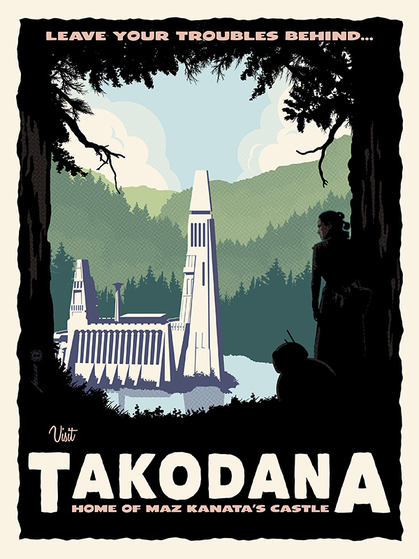 Star Wars: The Force Awakens inspired print. Leave Your Troubles Behind...Visit Takodana - Home of Maz Kanata's Castle Art by Brian Miller Artist proof (1 of 20 pieces) hand-numbered fine-art silk screen print each print has the artist's authorized signature 18" x 24" comes with certificate of authenticity Officially licensed art