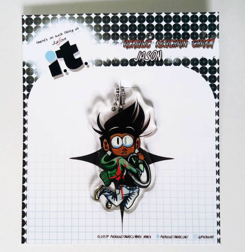 Double-sided acrylic keychain featuring character Jason. Dimensions: H8cm x W4.8cm Includes 13cm silver metal bead chain.