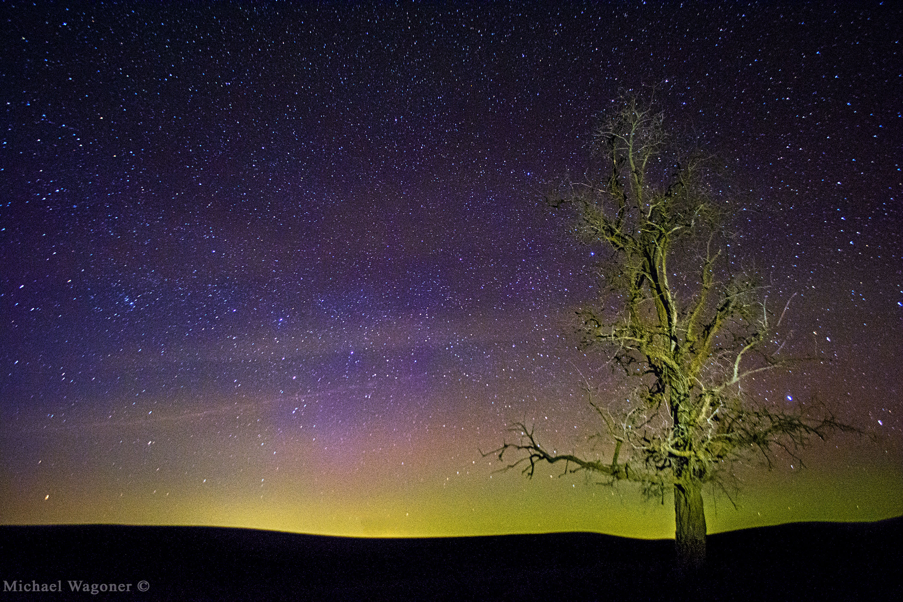 Taken late April 2017, this shot of the northern lights is really made all the more remarkable by the illumination of a lone tree just south of Steptoe Butte in Washington state.