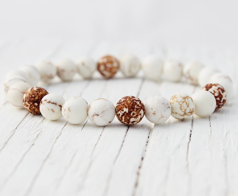 These beautiful and natural agate beads have flecks of white, off-white, caramel, and many other different hues of brown. Accented with white turquoise (magnesite). This listing is for the single white and brown bracelet only. Perfect to wear alone or stacked with other bracelets in our collection as shown.