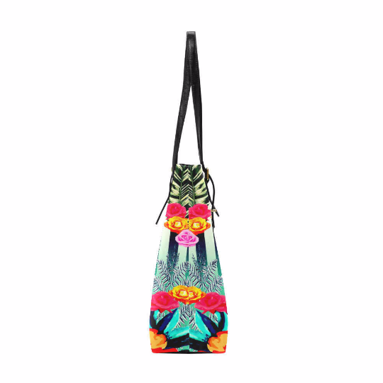 Funky Flamingo Black & White Stripe with Flowers Tote Bag. Design with Pink Flamingos, Peacocks, with Black and White strips with Leaves, Love Hearts and Flowers on green background.