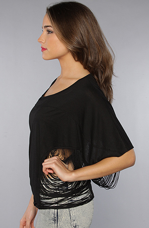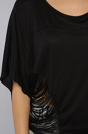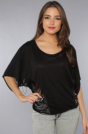 100% viscose oversized top with batwing sleeves and side fringe detail. Metal Dangerously Beautiful plaque affixed on front.