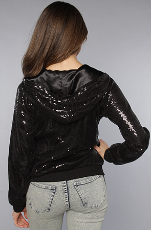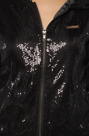 100% polyester hooded sequin jacket with double zippers. Front side pockets and metal Dangerously Beautiful plaque affixed on front.