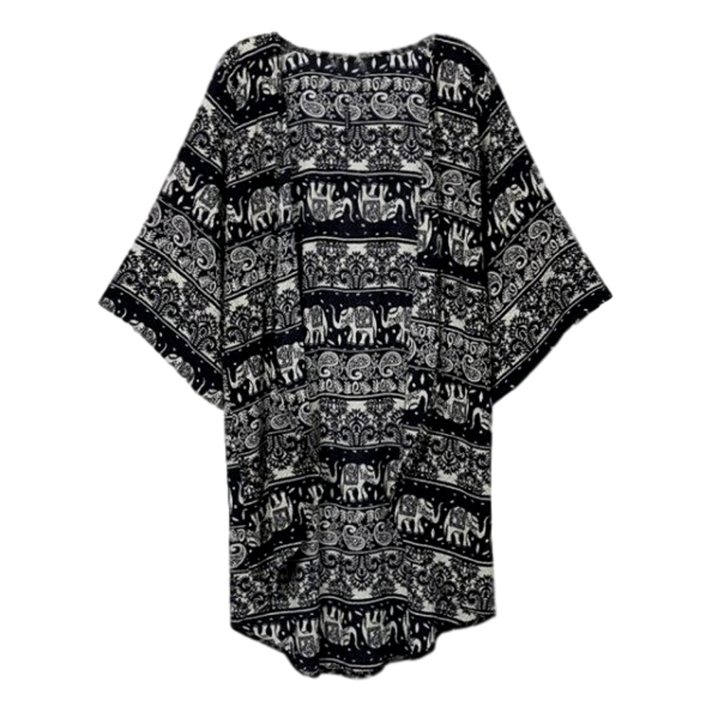 This delicate kimono features a tribal tile print in navy & beige. Made of a soft touch fabric with a longline cut, the oversized fit falls generously over the body. Mid length bell flare sleeves complete the look. -Material: 100% Polyester -Design: Open front 3/4 Sleeve and loose style -Handwash -Imported -Sizing Chart: Small -- Bust: 37.8'' Waist: 39.4'' Sleeve: 16.3'' Length: 39.8'' Medium -- Bust: 39.4'' Waist: 40.9'' Sleeve: 16.7'' Length: 40.6'' Large -- Bust: 40.9'''' Waist: 42.5'' Sleeve: 17.1'' Length: 41.3'' X-Large -- Bust: 42.5'' Waist: 44.1'' Sleeve: 17.5'' Length: 42.1''