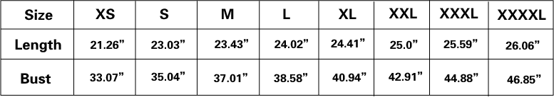 Sizes: XS, S, M, L, XL, XXL, XXXL, XXXXL. Please calculate your size from the measurement chart below.