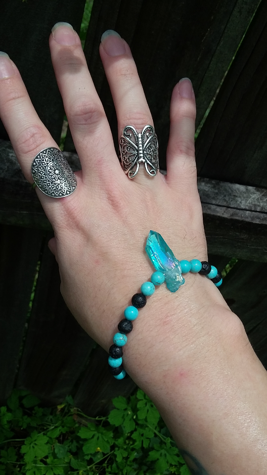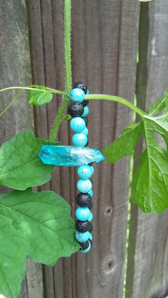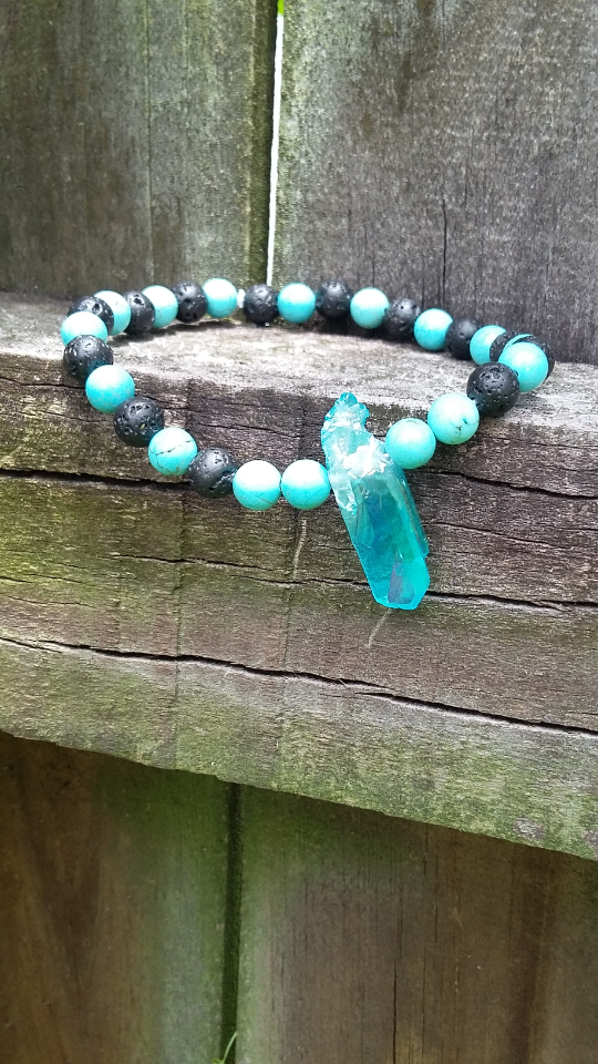 Beautiful handmade stretch bracelet featuring Aqua Aura Quartz howlite, and Lava Rock. This beautiful bracelet is an essential oil diffuser! Just a drop of your favorite essential oil on the Lava rock to diffuse. Size Medium/Small stretch bracelet