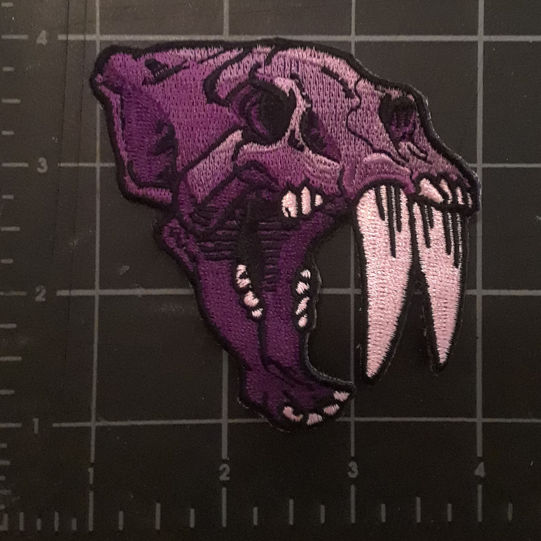Saber Tooth Tiger Skull Patch Sew on Patch, 3" X 3" If you like purple and prehistoric mammals, this embroidered patch is for you- RAWR