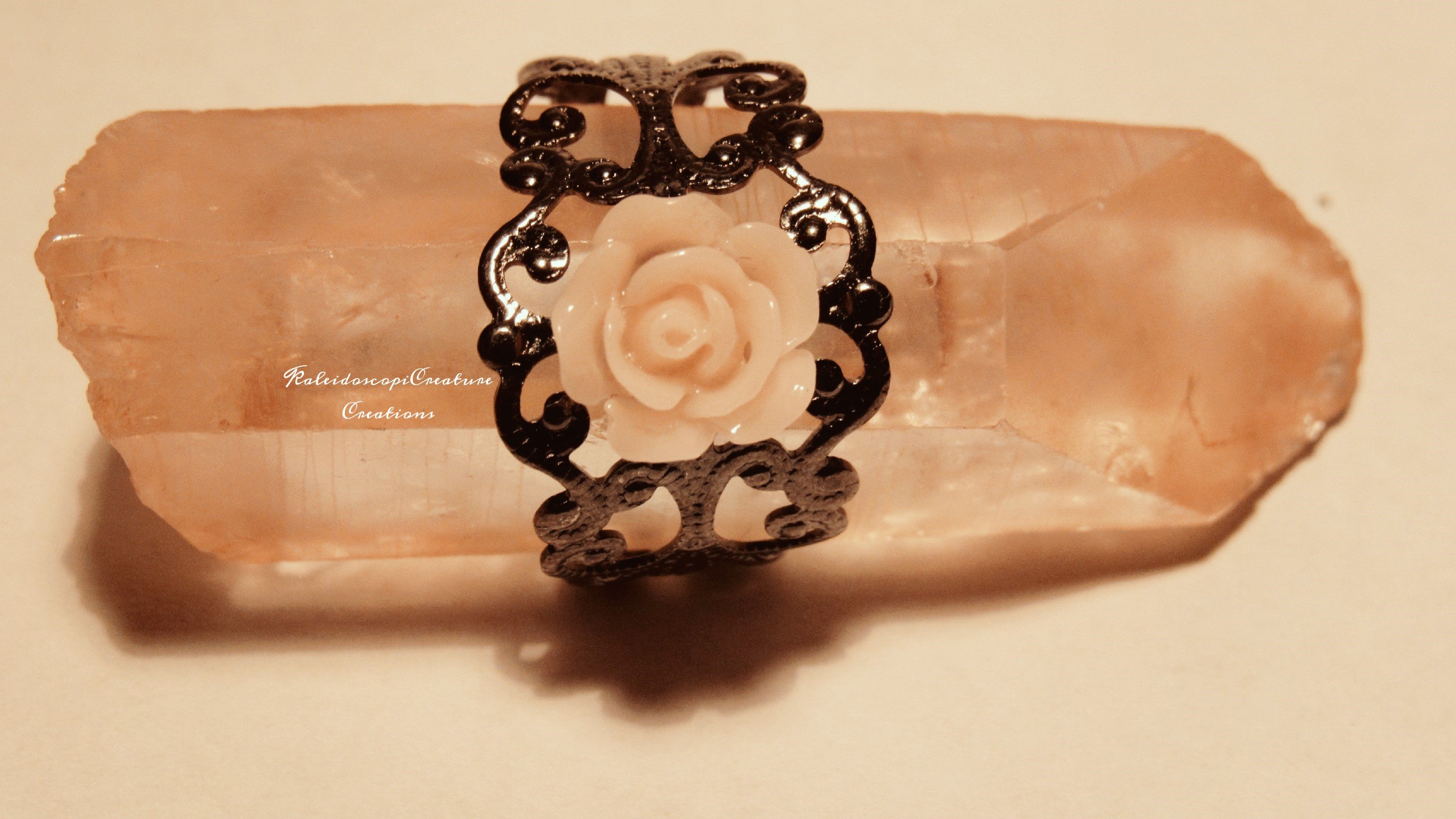 A very beautiful and ornate adjustable ring adorned with a pink rose ring base is made of bronze and plated in hematite color