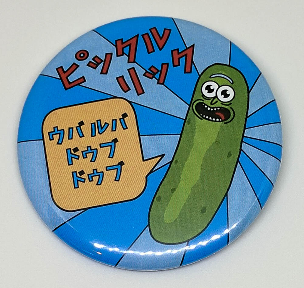 ピックル リック! (Pickle Rick!) Inspired by fish-bulb Mr. Sparkle from The Simpsons, and Rick & Morty's general ridicul-awesomeness. Complete with Rick's signature catch phrase ウバ ルバ ドゥブ ドゥブ. (Wubba lubba dub dub) Perfect for disrespecting dirt, expressing your constant pain, or just adding something others will point and exclaim at to objects you own. Pinback button with original art and translation.