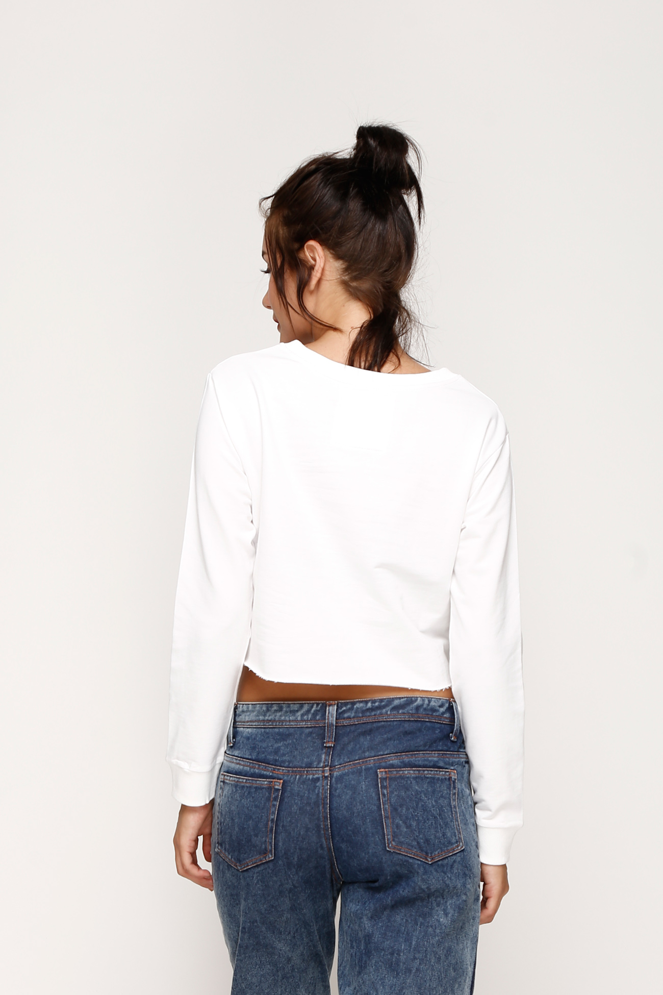 PRODUCT DETAILS - Cropped sweatshirt in baby terry fabric - Long sleeves - Ribbing at neckline and cuffs - Raw-edge hem - Model’s height : 175 cm - Model wears size M COMPOSITION - 100% Cotton (Baby Terry) CARE - Machine wash cold with similar colors - Do not bleach - Tumble dry low, remove promptly - Cool iron if needed Please check the size guide on the last image
