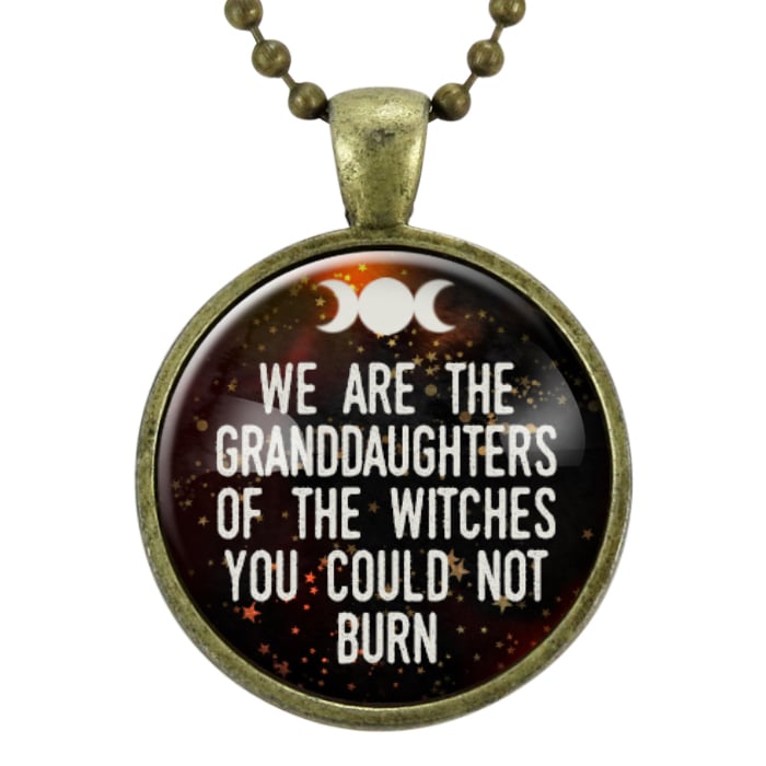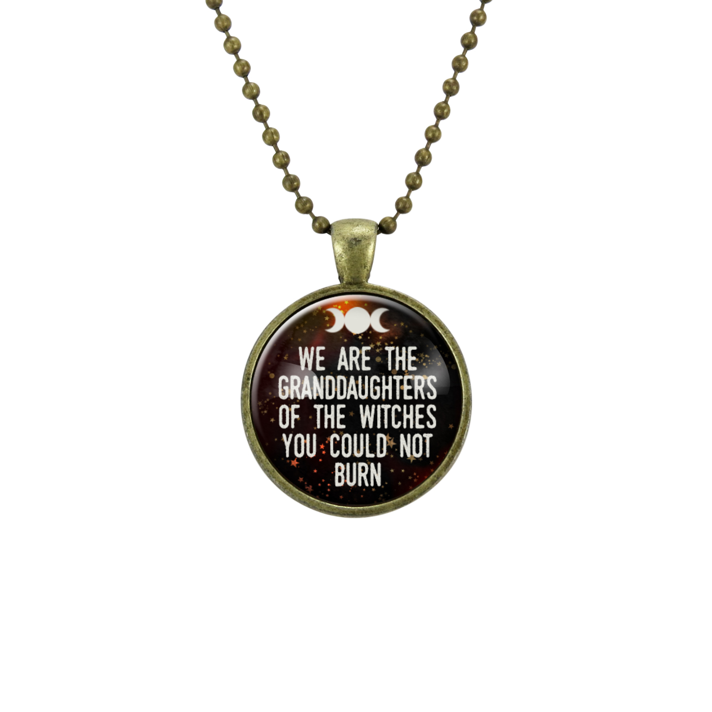 This handmade pendant necklace features the quote, "we are the granddaughters of the witches you could not burn!" Pendant size is 25 mm (approximately 1 inch) and hangs from a matching 24-inch bronze ball chain. Fine art print sealed under a smooth glass cover. Handmade in the USA!