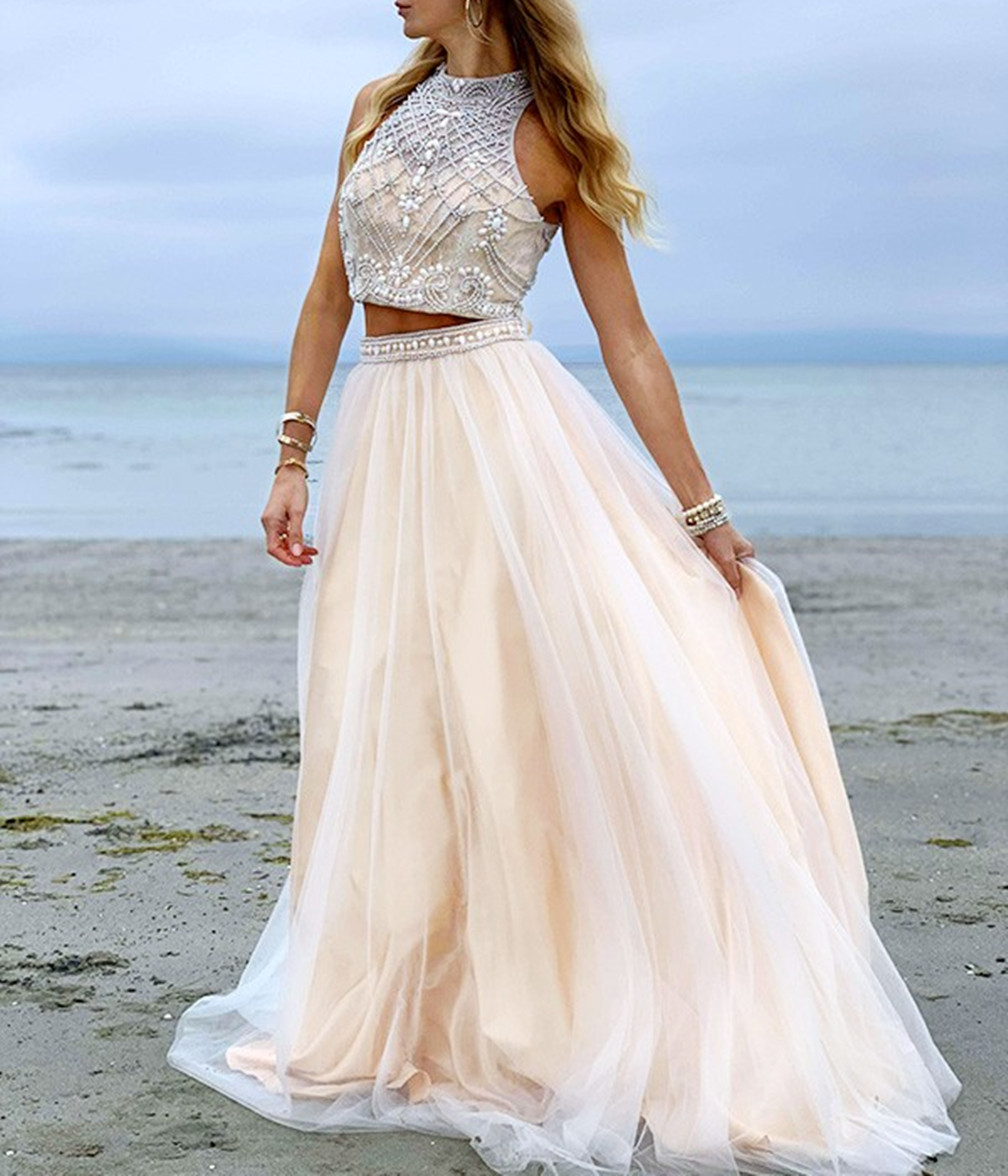 A-Line/Princess Beaded Bodice Evening Party Gowns Beadings Sleeveless Formal Prom Dresses Long A064-2