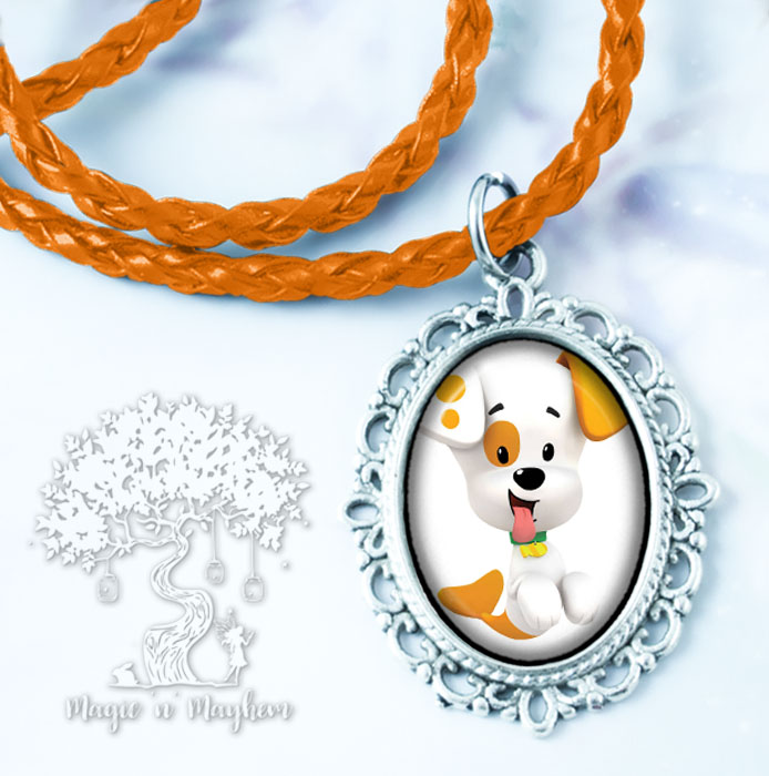 Dive into the sea with this cute necklace of Bubble Puppy. The image is sealed behind resin and set into a lovely lacy. This pendant comes on a 17 inch orange faux leather cord with a lobster clasp and 2 inch extender. This item is handmade and I accept alteration requests and custom orders.