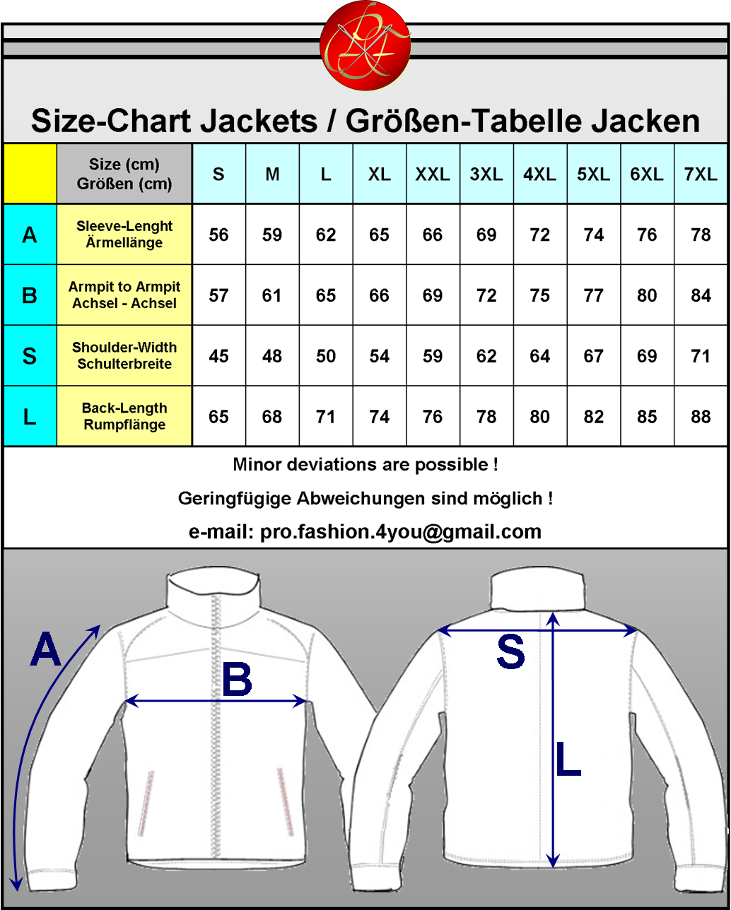 Please take one of your clothes that suits you well, measure and then compare with our size charts. Measure your jacket (clothes), not your body !