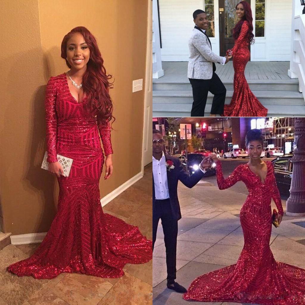 Burgundy Mermaid Dress Shiny V Neckline Floor Length Long Train Sequin African Prom Dresses Long Sleeves Formal Dress Women