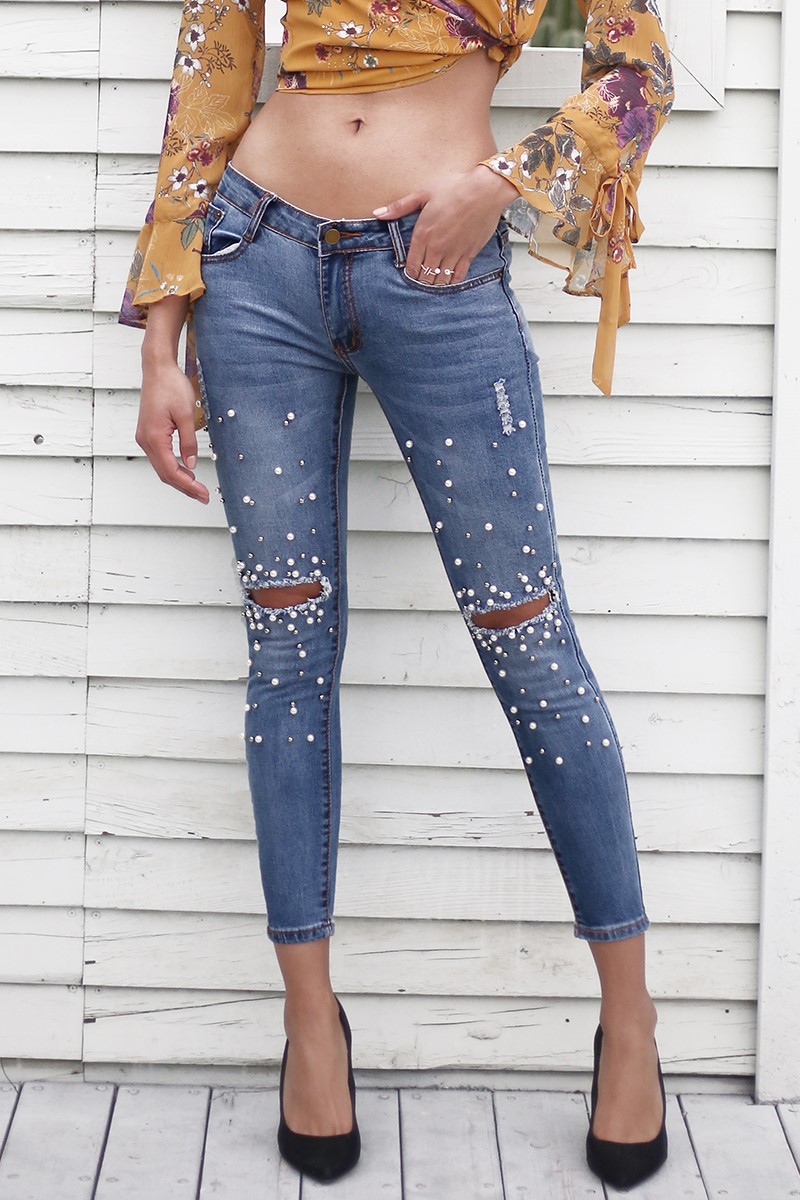 Streetwear Pearl Hole Casual Pocket Skinny Pencil Low Waist Jeans