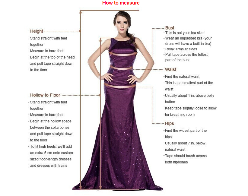 If it is a rush order, remember to leave the deadline for the dress ( Important ! ) All of our dresses are made to order, so please allow 10-20 days for production. We prefer to make this dress according to your measurements and desired length. Measurements, which should be taken strictly according to the above instruction by professional, not by yourself. Description Color: As Photo /Color number Working time: about 10- 20 days Shipping Time: 3-7 days Custom Made Dress, Choose a standard size (2 - 24W ) or Show us the following size : ------------------------------------------------- 1.Full Bust:=____________ inches. 2.Waist: =_______________ inches. 3.Hips: = ________________ inches. 4. Hollow to Floor : = ___________inches. 5. Height (with shoes on ):=_________ inches. 6. Dress color =______________(you can choose from my color chart) ------------------------------------------------- Step 1: click on "Add to cart" Step 2: choose check out Step 3: fill out your personal information, like shipping address and contact details. Step 4: Select payment method and add notes of your size and color choice. Color Mismatch ------------------------------------------------- The setting of computer screen or photo capturing may alter the real color of the dress shown on our shop. Slight color aberration of your dress and the color shown on screen may not mean that the dress is defective or mis-shipped.