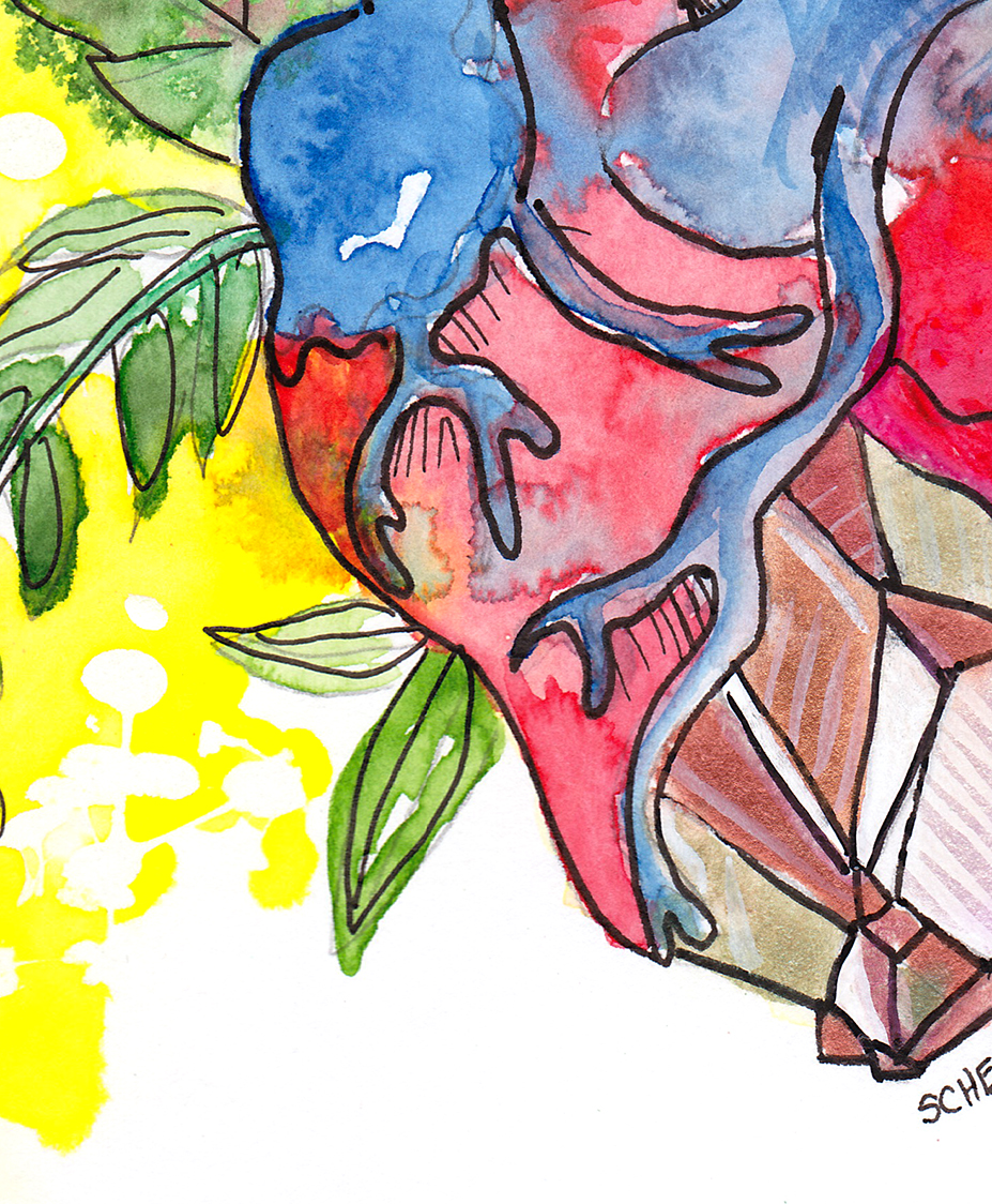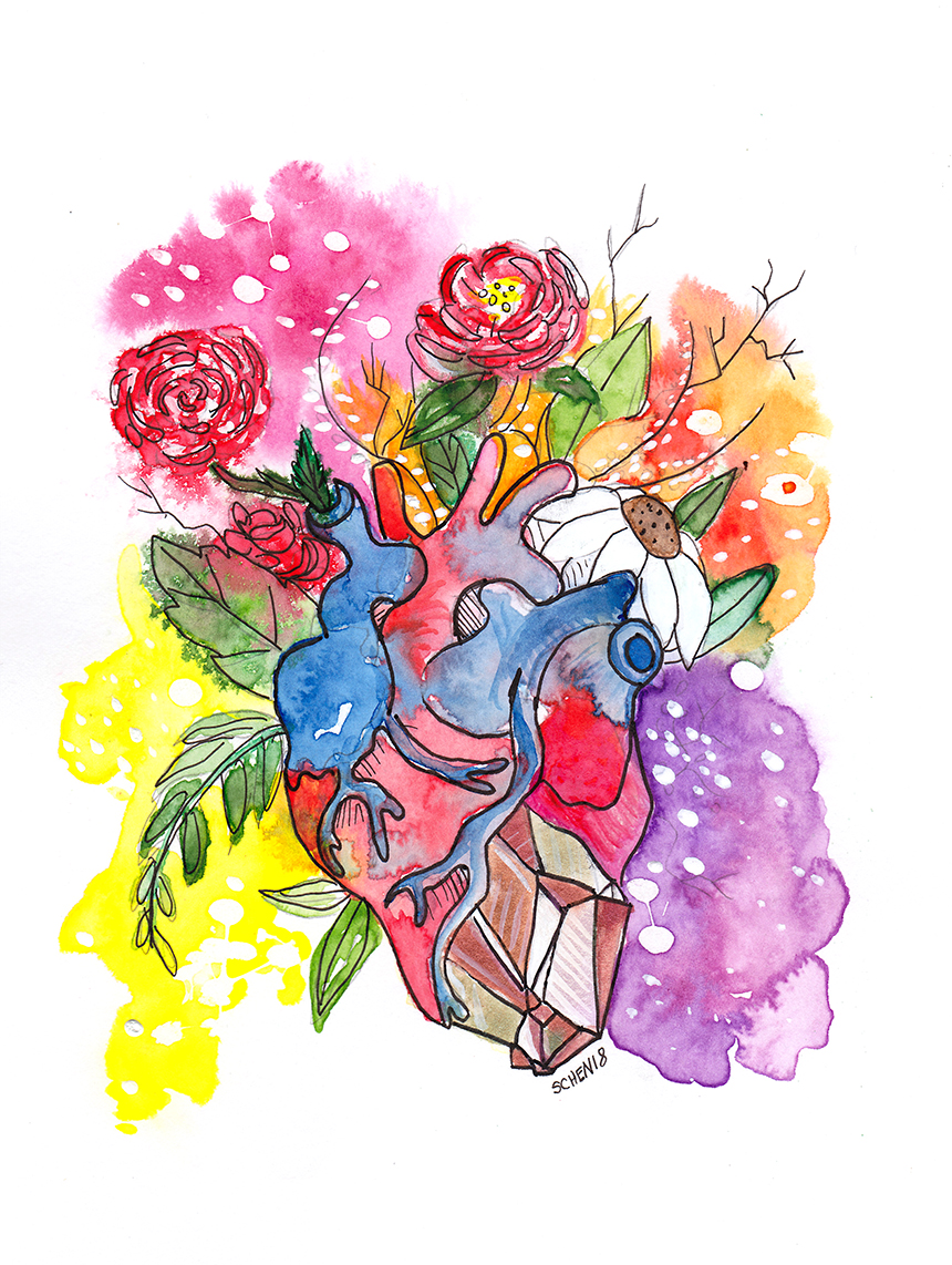 Hand illustrated and painted with watercolors from Germany and Japan. This heart beats wild and free with flowers and sparkling/shining crystal details. Original Painting/Mixed Media 6x8 inch
