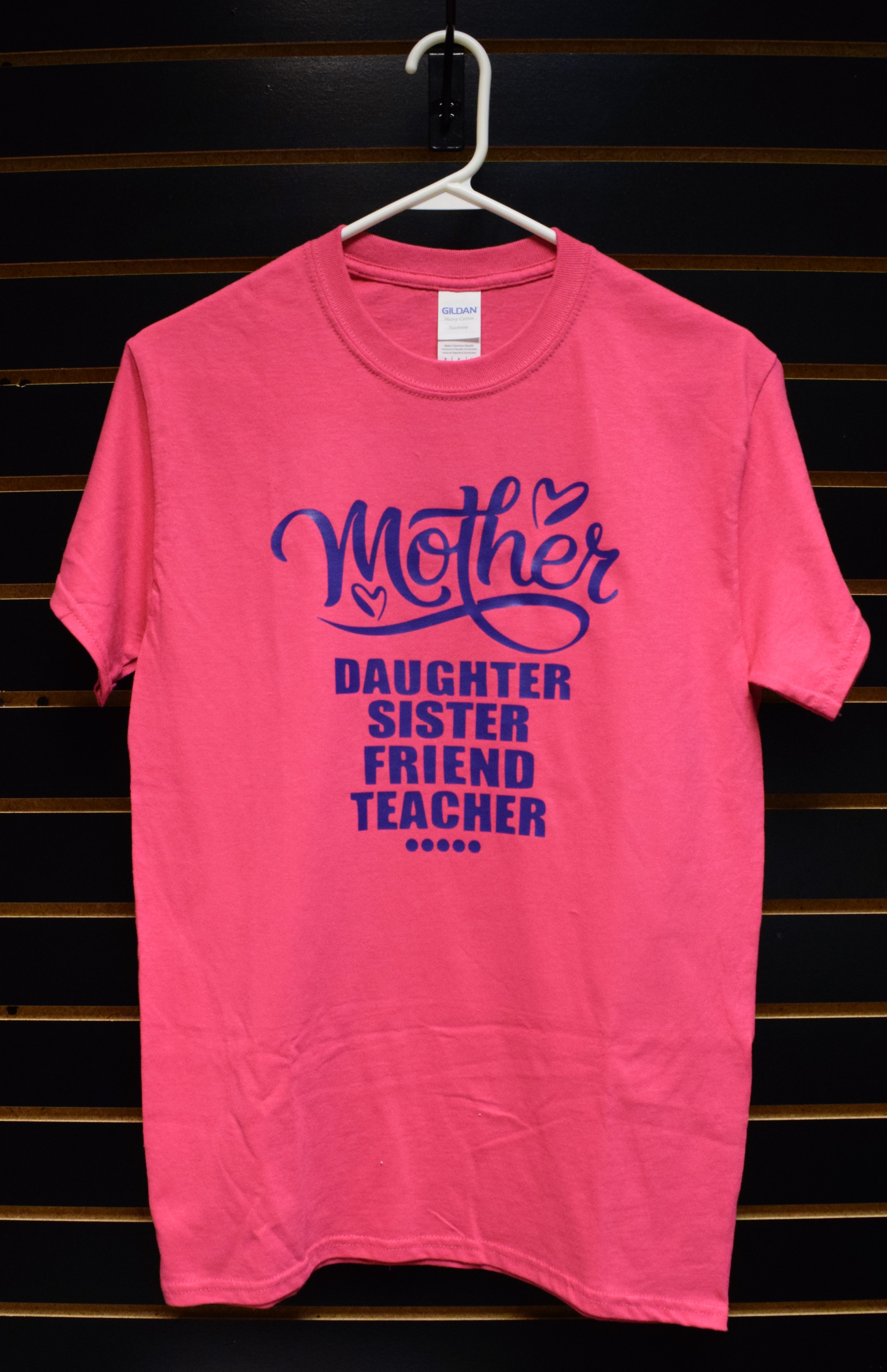 MOTHER, daughter, sister, friend, teacher. 100% preshrunk cotton Seamless rib at neck Taped shoulder-to-shoulder Double-needle stitching throughout Classic fit