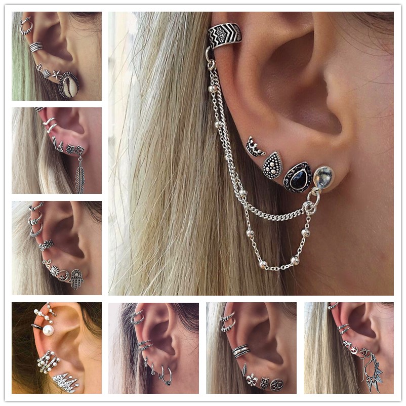 Bohemian Style Stud Earrings Set for Women Vintage Jewelry Ear Clips Chain