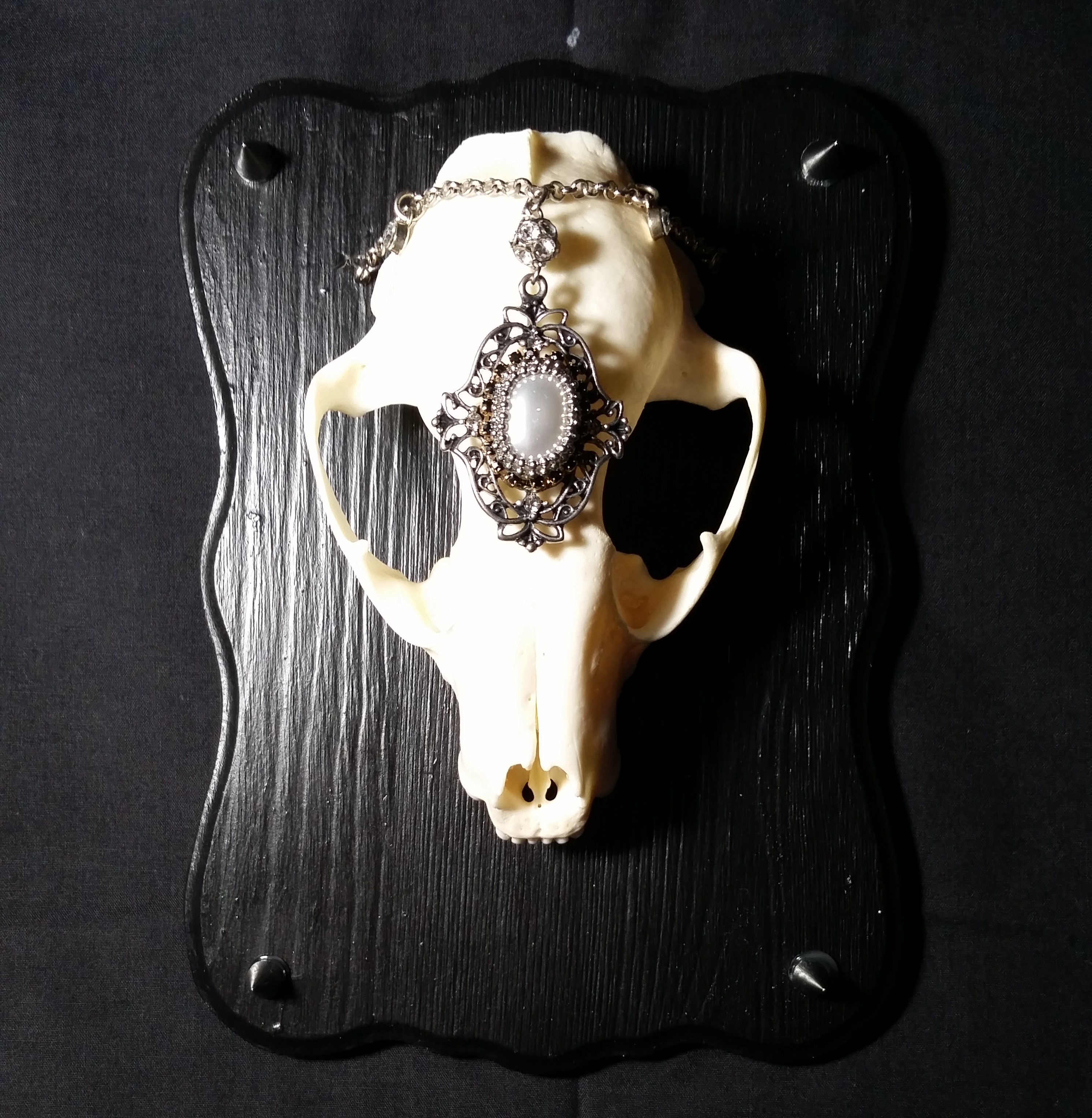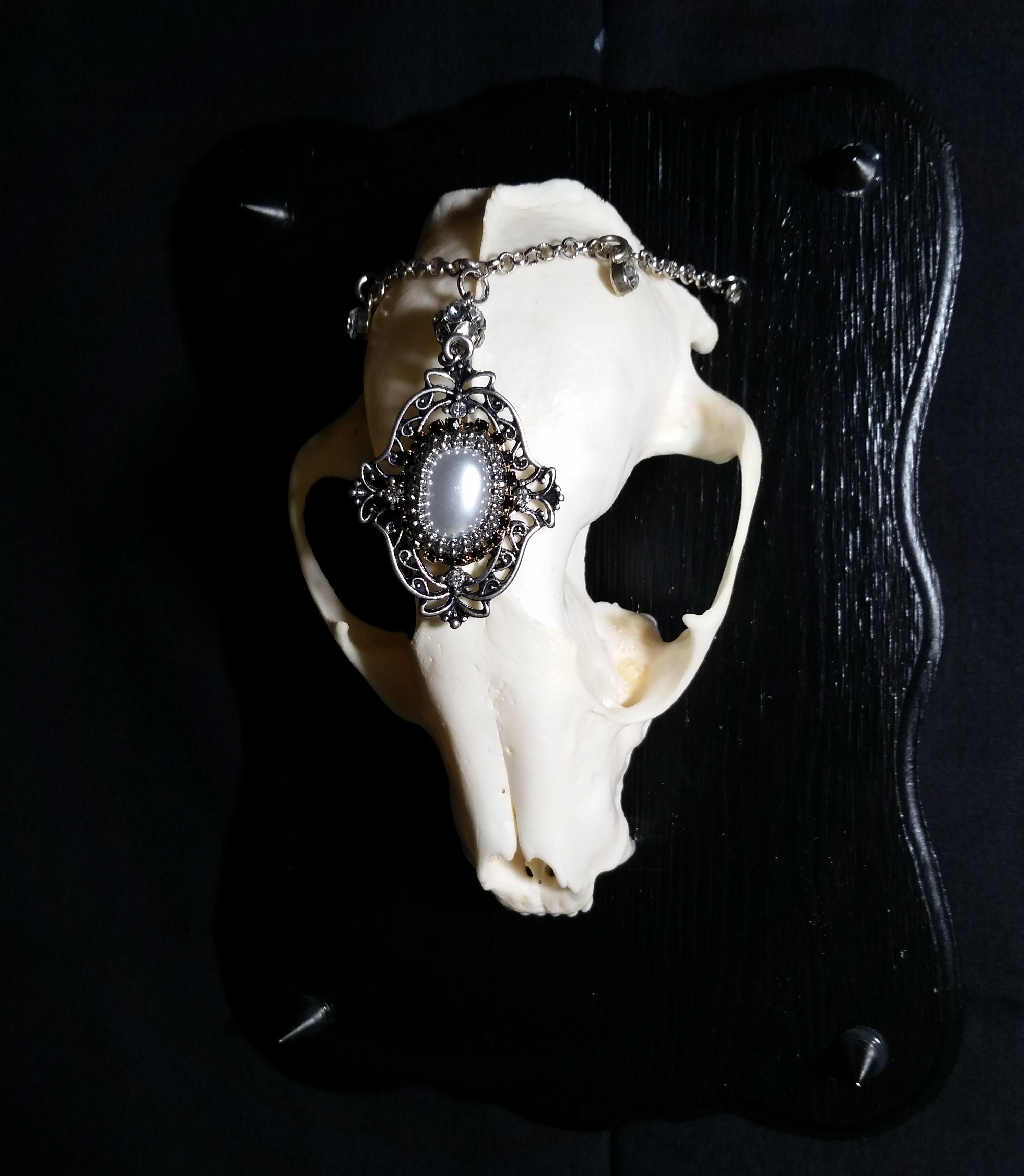 Real mounted raccoon skull detailed with a pendant and crystal charms on a quality wood mount. This piece is enforced with glue to ensure longevity. This piece was not killed by a human, and most likely died of natural causes.