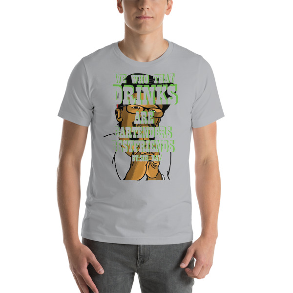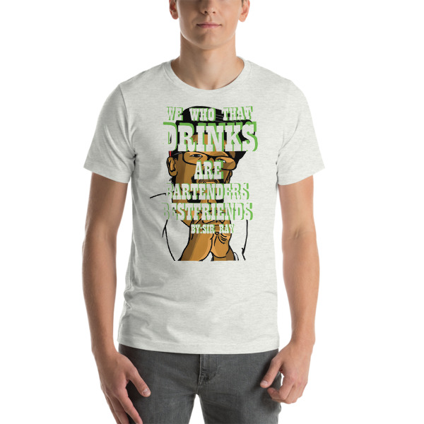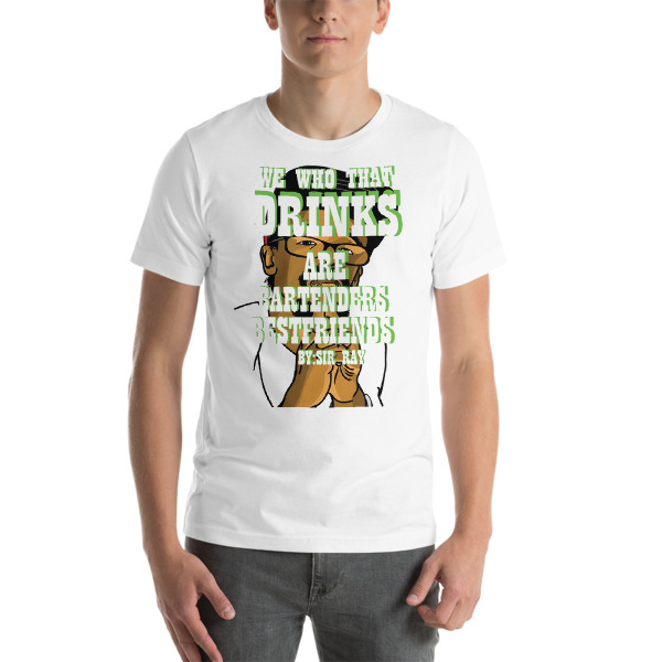 We Who That Drinks Are Bartenders Bestfriends By: Sir Ray Short-Sleeve Unisex T-Shirt This t-shirt is everything you've dreamed of and more. It feels soft and lightweight, with the right amount of stretch. It's comfortable and flattering for both men and women. • 100% combed and ring-spun cotton (heather colors contain polyester) • Fabric weight: 4.2 oz (142 g/m2) • Shoulder-to-shoulder taping • Side-seamed Model is wearing a size M. He's 6.2 feet (190 cm) tall, chest circumference 37.7" (96 cm), waist circumference 33.4" (85 cm).