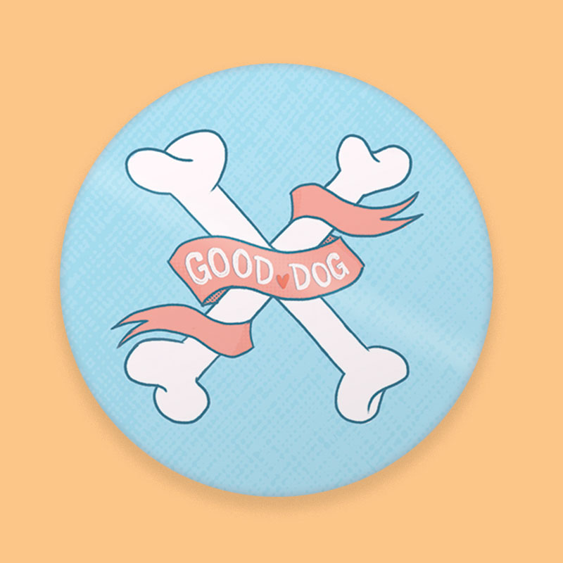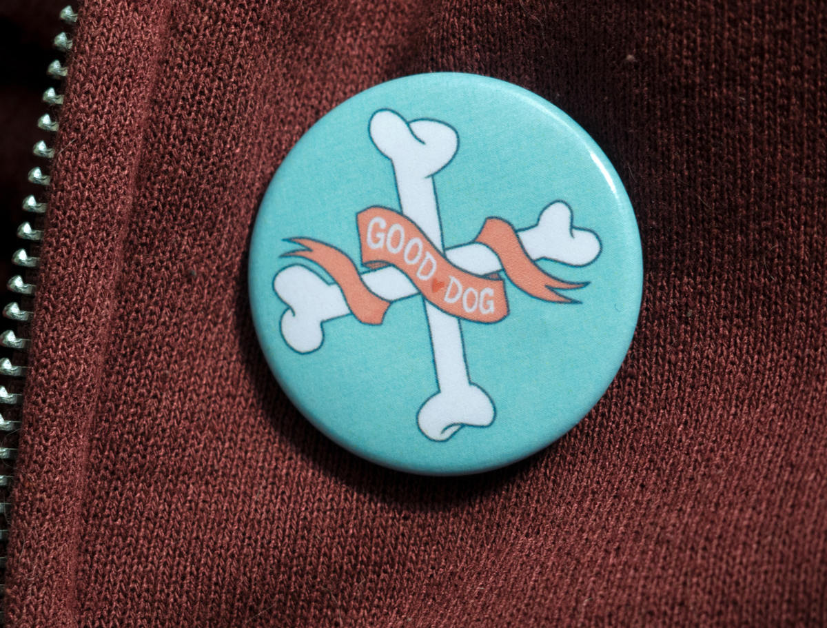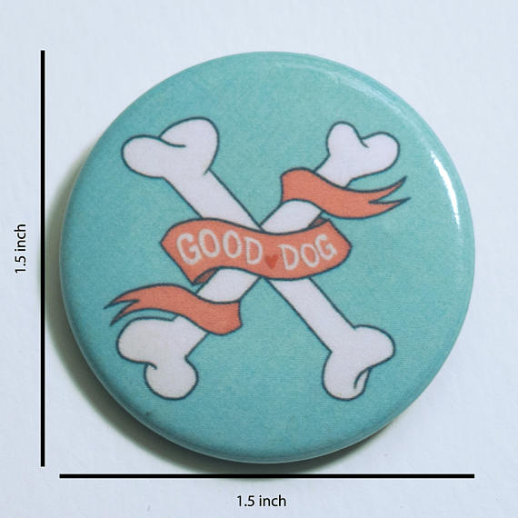 A pin to give to the best dog you know. Button measures 1.5" x1.5" Steel pin back.