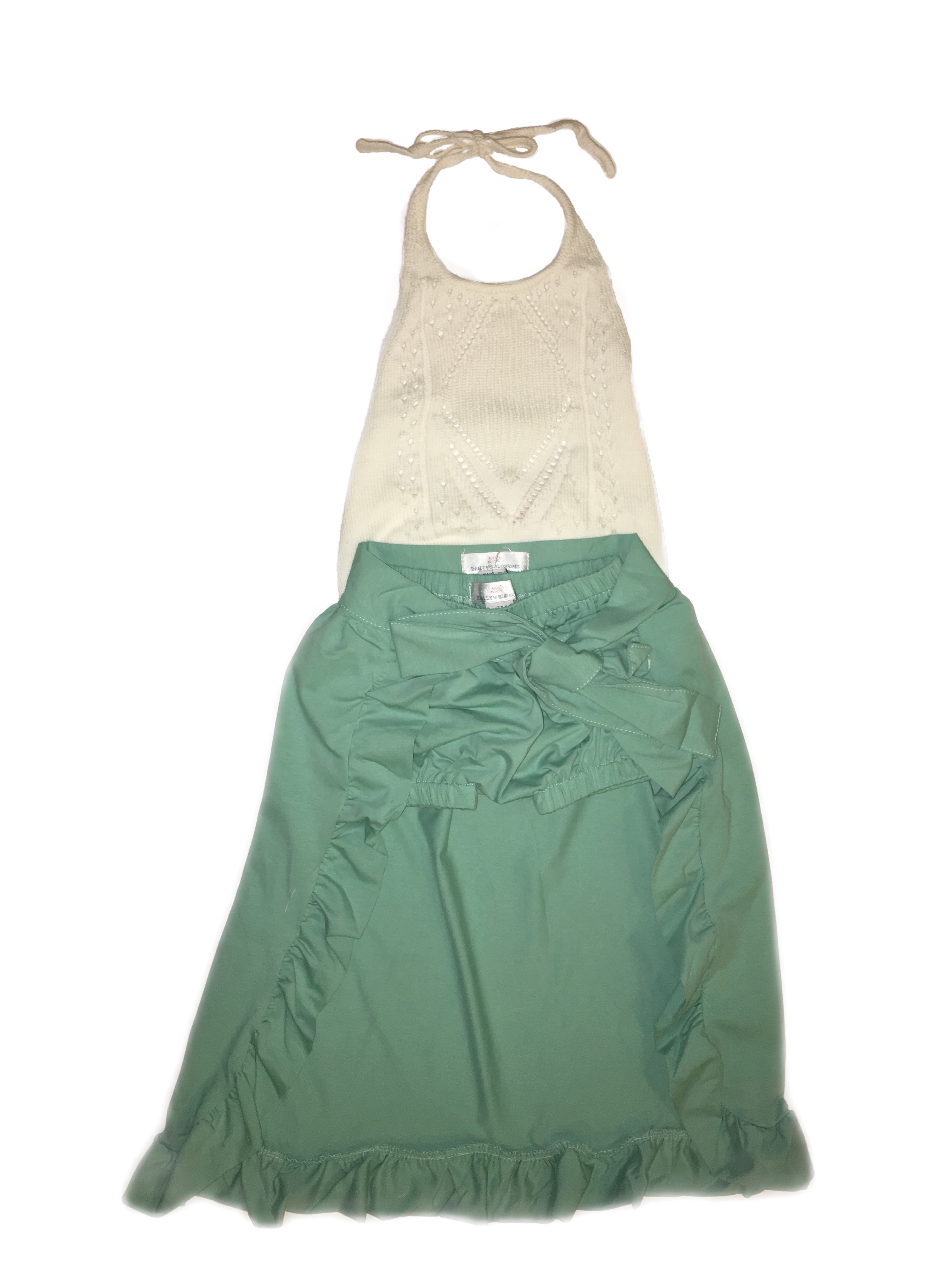 Seafoam green ruffle cape skirt with a cream crocheted halter leotard set! The cape skirt wraps around a pair of ruched bubble shorts! 3 separate pieces!