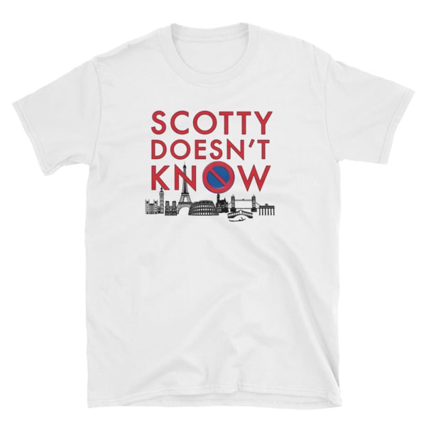 SCOTTY DOESN'T KNOW Short-Sleeve Unisex T-Shirt • 100% ringspun cotton • 4.5 oz (153 g/m2) • Pre-shrunk • Shoulder-to-shoulder taping • Quarter-turned to avoid crease down the center
