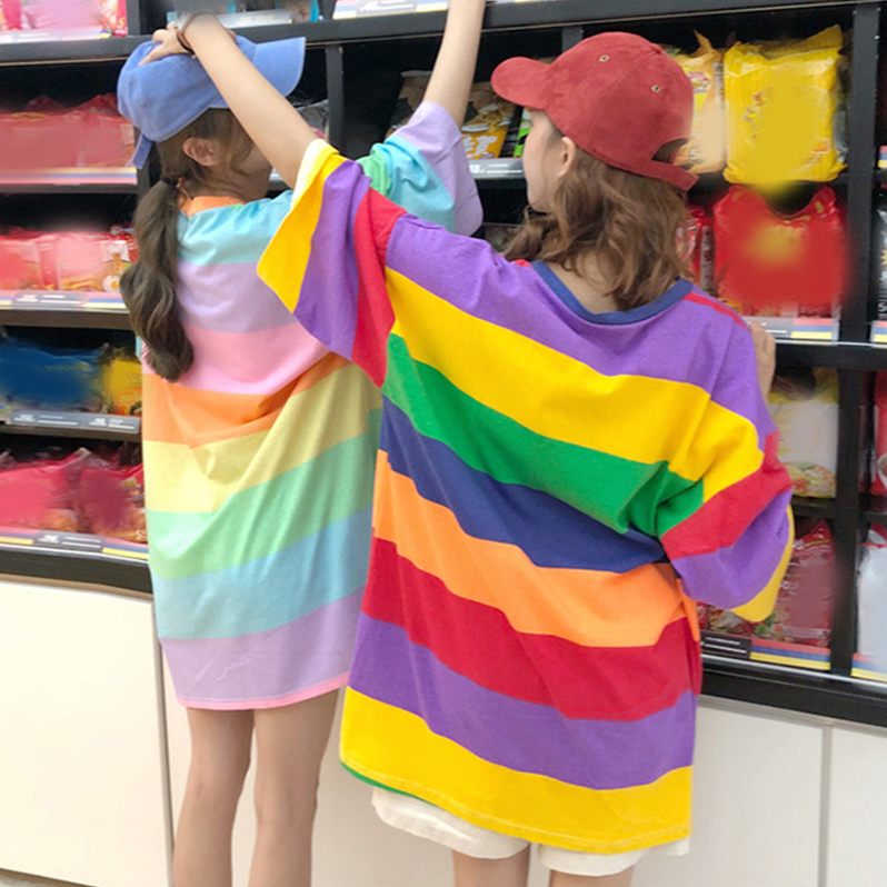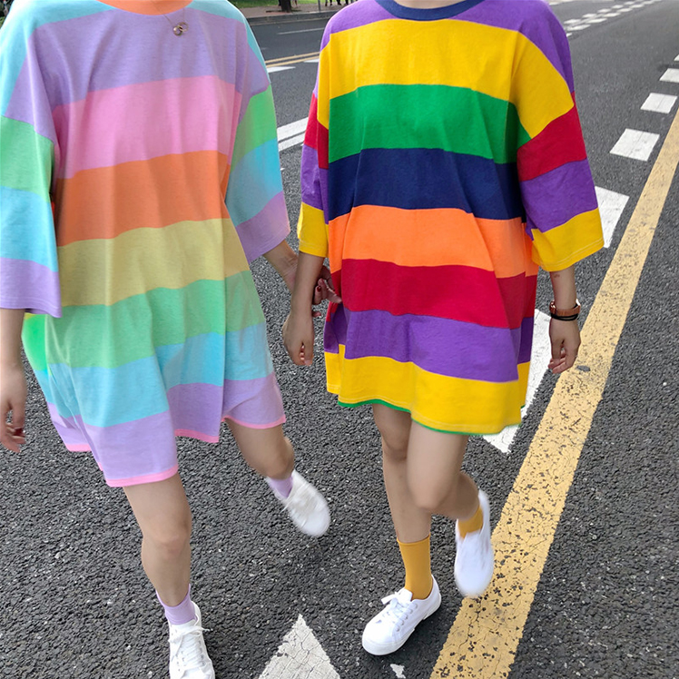 ♡Color: pastel rainbow, dark rainbow ♡Style: stripe ♡Size: Length: 82cm / 32.3in Bust: 124cm / 48.8in Shoulder: 62cm / 24.4in Sleeve: 27cm / 10.6in ♡Package include: 1 x t-shirt