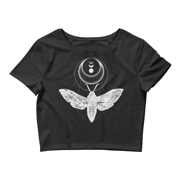 Black Moth And Crescent Moon Black Crop Top, Lunar Goth Tee Shirt, Festival Clothing, Insect Space Witch Aesthetic, Wicca Fashion-1