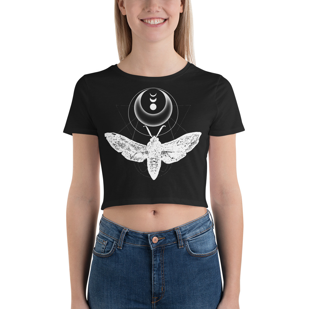 Black Moth And Crescent Moon Black Crop Top, Lunar Goth Tee Shirt, Festival Clothing, Insect Space Witch Aesthetic, Wicca Fashion
