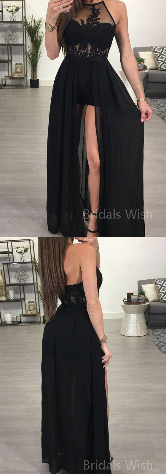 Black long prom dresses, halter long prom dresses,applique long prom dresses,side slit long prom dresses, BW0268