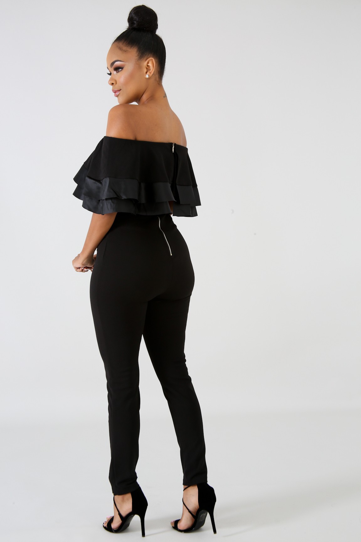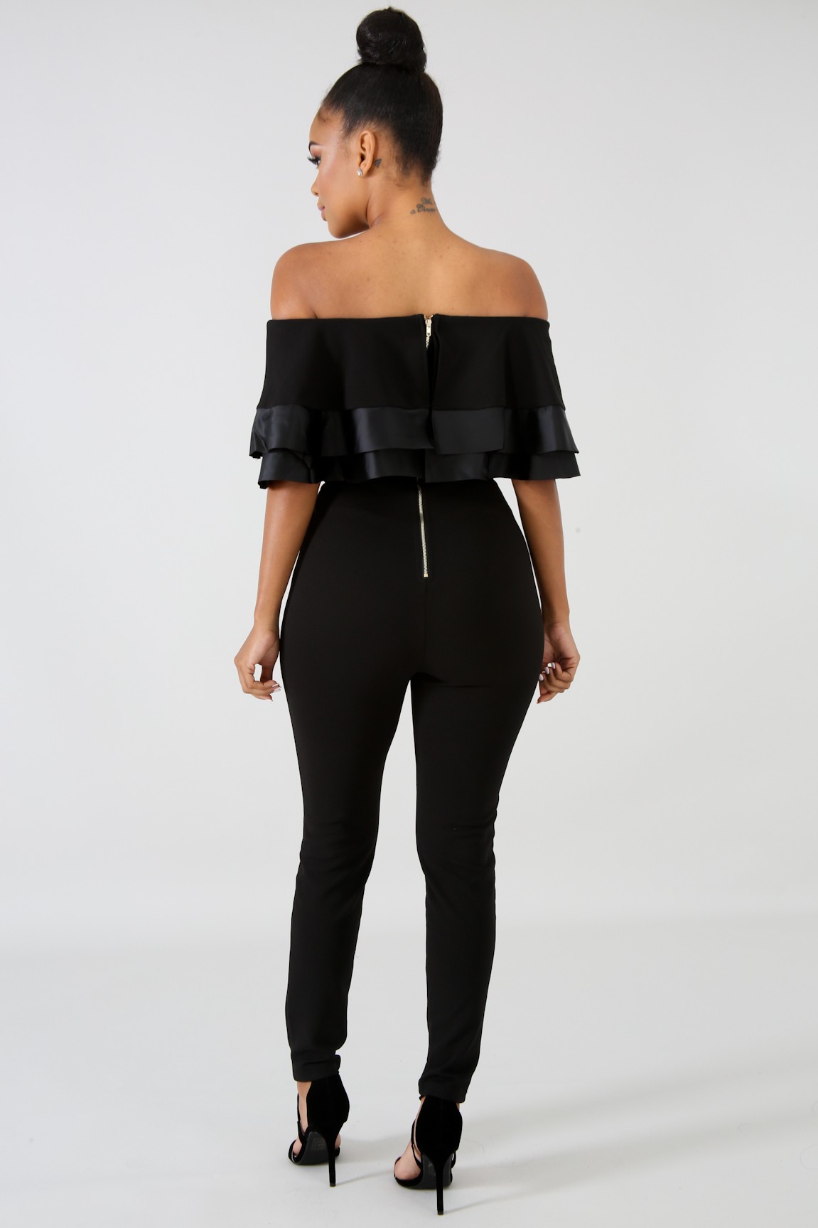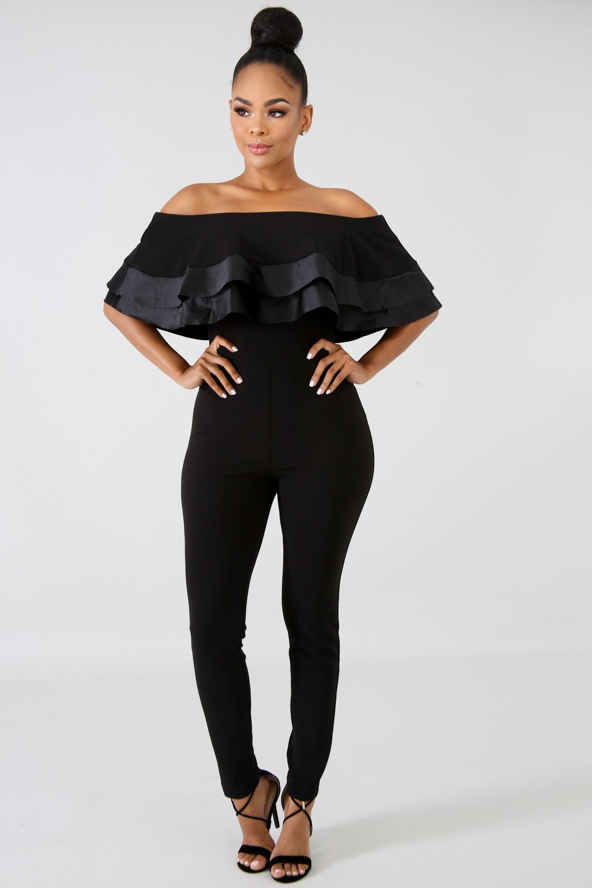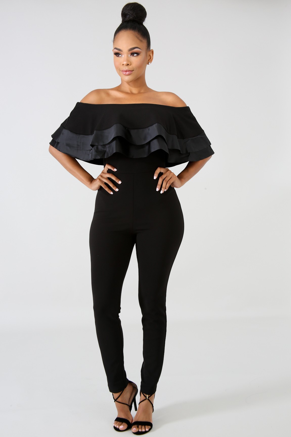 Description This jumpsuit features a stretch fabric, off the shoulders, ruffle details, and zipper closure. Model is wearing a small 97% Polyester 3% Spandex Hand wash cold water Do not bleach MODEL STATS(BURGUNDY, ROYAL) Height: 5.7" Bust:34" / Waist:26" / Hips:42" Height: 5.7"(BLACK) Bust:31" / Waist:26" / Hips:40"