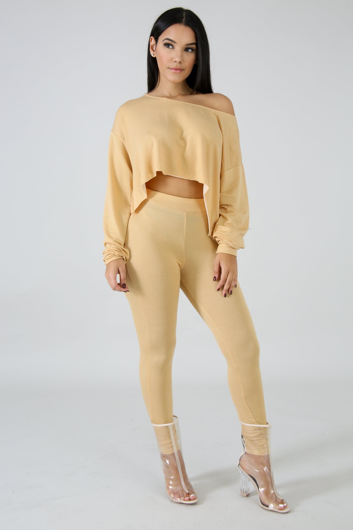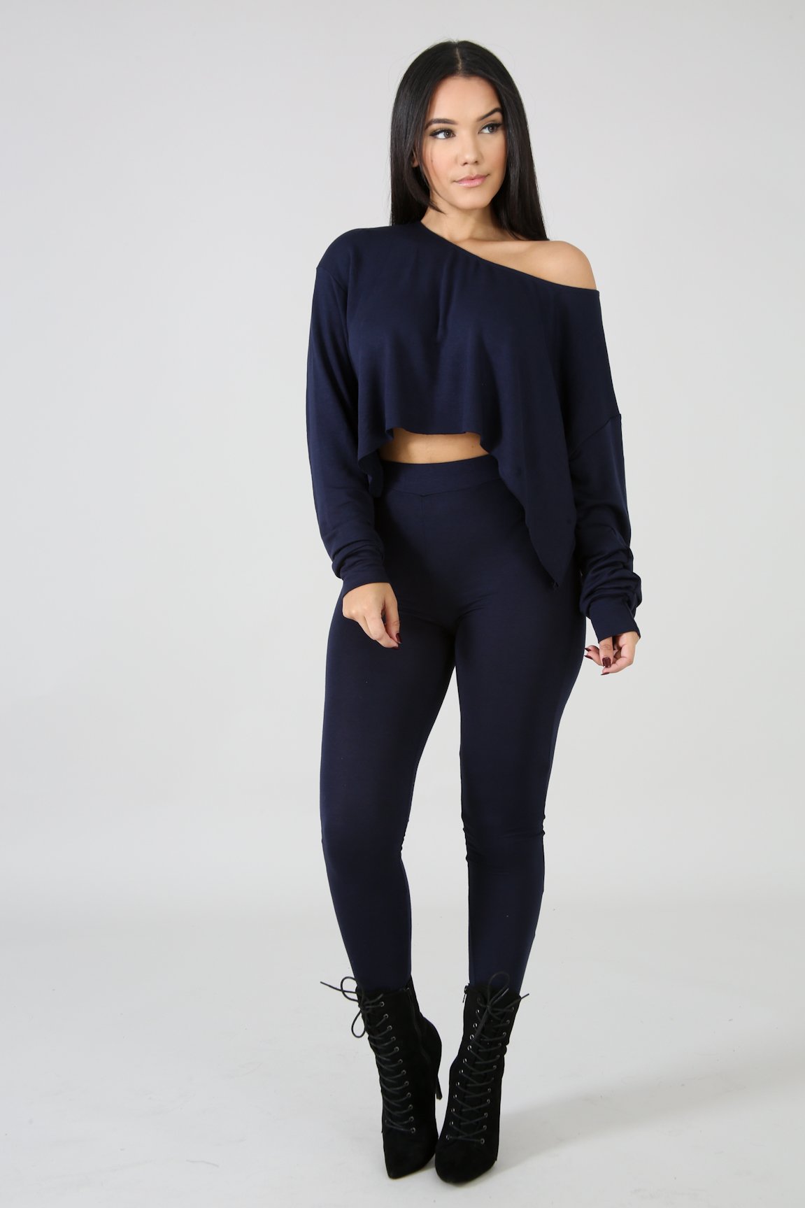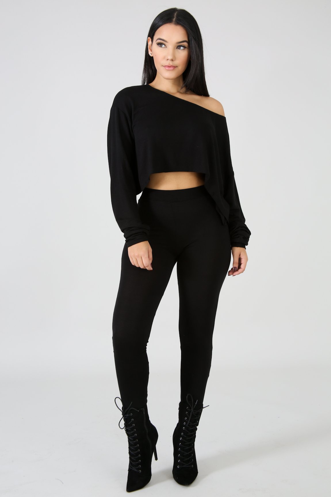 Description This set features a stretch fabric, long sleeves, off the shoulder, and an elastic waist. Model is wearing a small 87% Polyester 9% Rayon 4% Spandex Hand wash cold water Do not bleach MODEL STATS Height: 5.7" Bust:34" / Waist:26" / Hips:42"