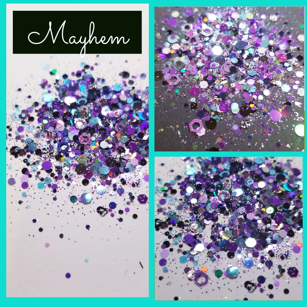 Glitter mix made with blue, lavender and black mix dots, hollowed hex and camo hex, perfect for nail art, slime, crafts, tumblers and other DIYs. Quantity is 1.5 tsp